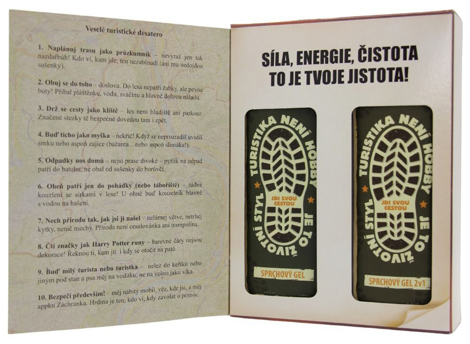 Hledáte originální dárek pro někoho, kdo rád vyráží na túry, výlety a objevuje krásy přírody? Kosmetická sada ve tvaru knihy pro turisty je tou pravou volbou. Na první pohled vypadá jako cestovatelská knížka, uvnitř ale ukrývá překvapení – dva sprchové gely po 250 ml, které přijd celý popisou vhod po každém dobrodružství.