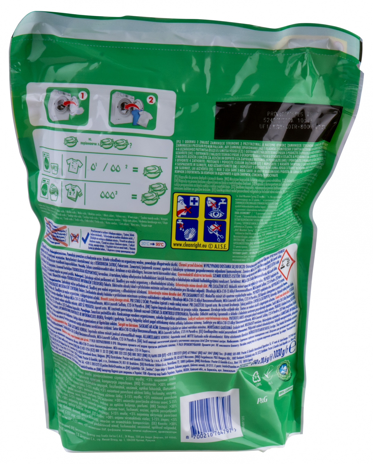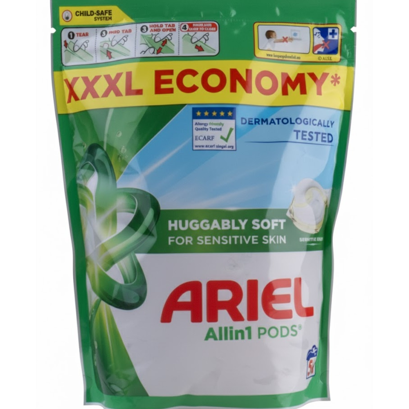 Ariel All in 1 Pods Sensitive Skin gelové kapsle 50 kusů k praní bílého a světlého prádla. Abyste používali kapsle efektivně, nejdřív do prázdného bubnu pračky vložte kapsli a až pak přidejte prádlo.