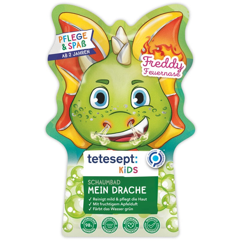 Bublinková koupel Dráček s jablečnou vůní a hravým tvarem dráčka – obal lze po vymytí použít jako maňáska. Pěna do koupele obsahuje extra jemné složení s aloe vera speciálně přizpůsobené citlivé dětské pokožce. Bezpečné potravinářské barvivo zbarví vodu do zelena, ale neobarví po celý popiskožku, vlasy ani vanu.