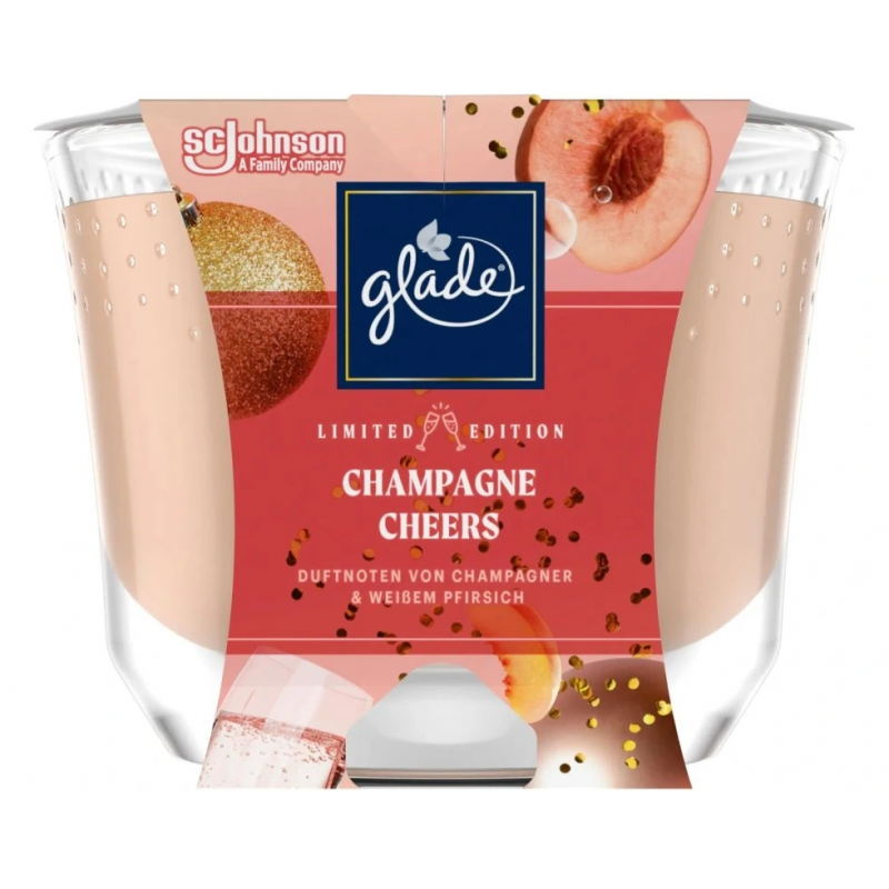 Vonná svíčka GLADE provoní interiér kombinací šampaňského a čerstvé broskve, která navodí osvěžující a radostnou atmosféru. Masivní sklenička poslouží i jako vkusná dekorace.