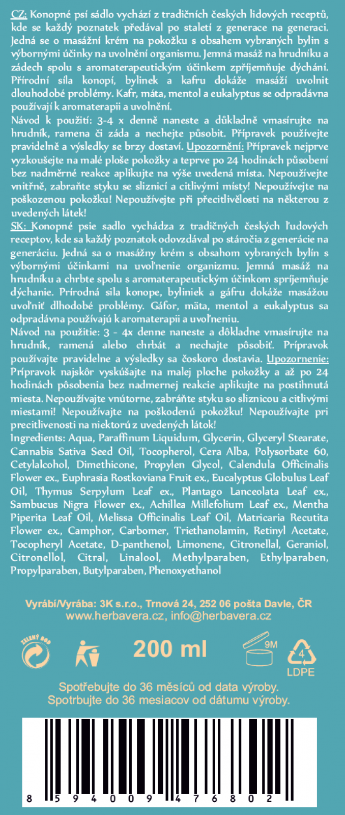 Konopné psí sádlo s kafrem vychází z tradičních receptů českého lidového léčitelství, kde se každý poznatek předával po staletí z generace na generaci jedná se o masážní krém s obsahem vybraných bylin s výbornými účinky na uvolnění organismu jemná masáž na hrudníku a zádech zpříj celý popisemňuje dýchání při nachlazení, kašli a rýmě. Kafr je přírodní látka získávaná původně ze dřeva stromu kafrovníku a odpradávna se používal pro aromaterapie a uvolnění dýchacího ústrojí.