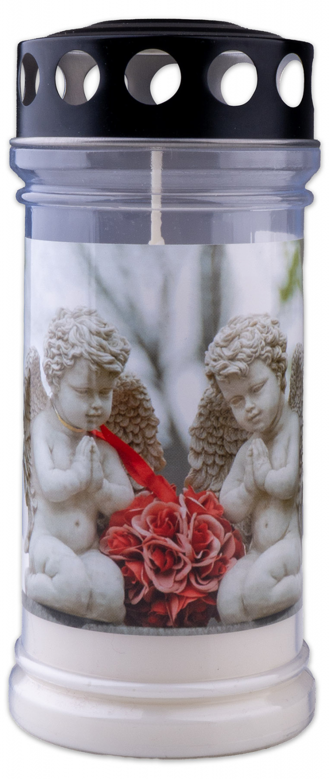 Svíčka PROVENCE Andělé vyrobená z kvalitního plastu s hladkým povrchem, odolává vlhkosti i mrazu, takže je ideální pro celoroční venkovní použití. Černé víčko spolehlivě chrání plamen před větrem i deštěm a umožňuje, aby svíčka hořela nepřetržitě až 96 hodin, bez nutnosti výměny celý popisnebo dohledu. Jemný motiv anděla v decentním provedení dodává výrobku symboliku ochrany a světla, které doprovází vzpomínku.