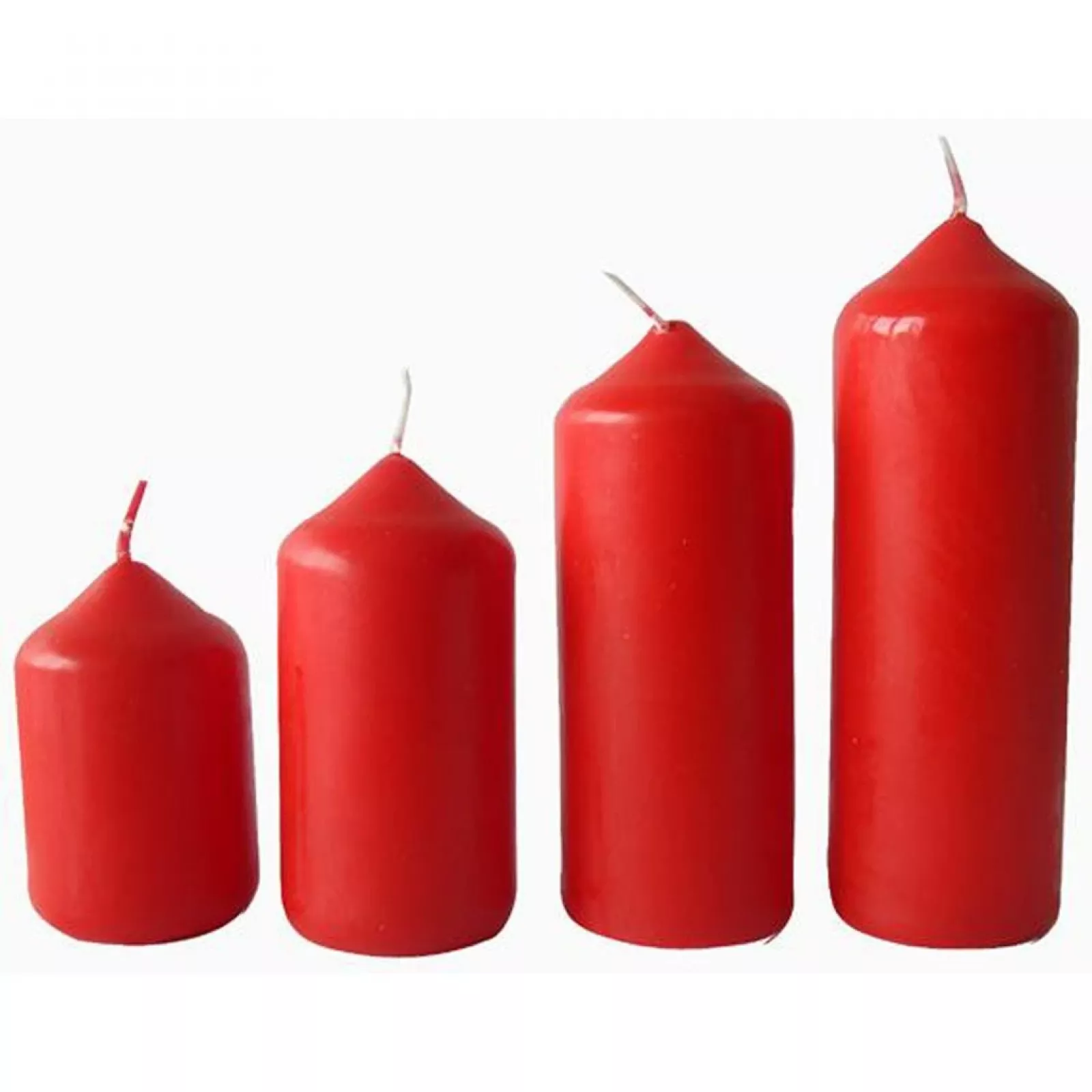 Adventní válcové stupňovité svíčky barva červená. Vhodné na adventní věnce. Výška svíček 6,5cm, 8,5cm, 10cm, 12cm, šířka 4cm.
