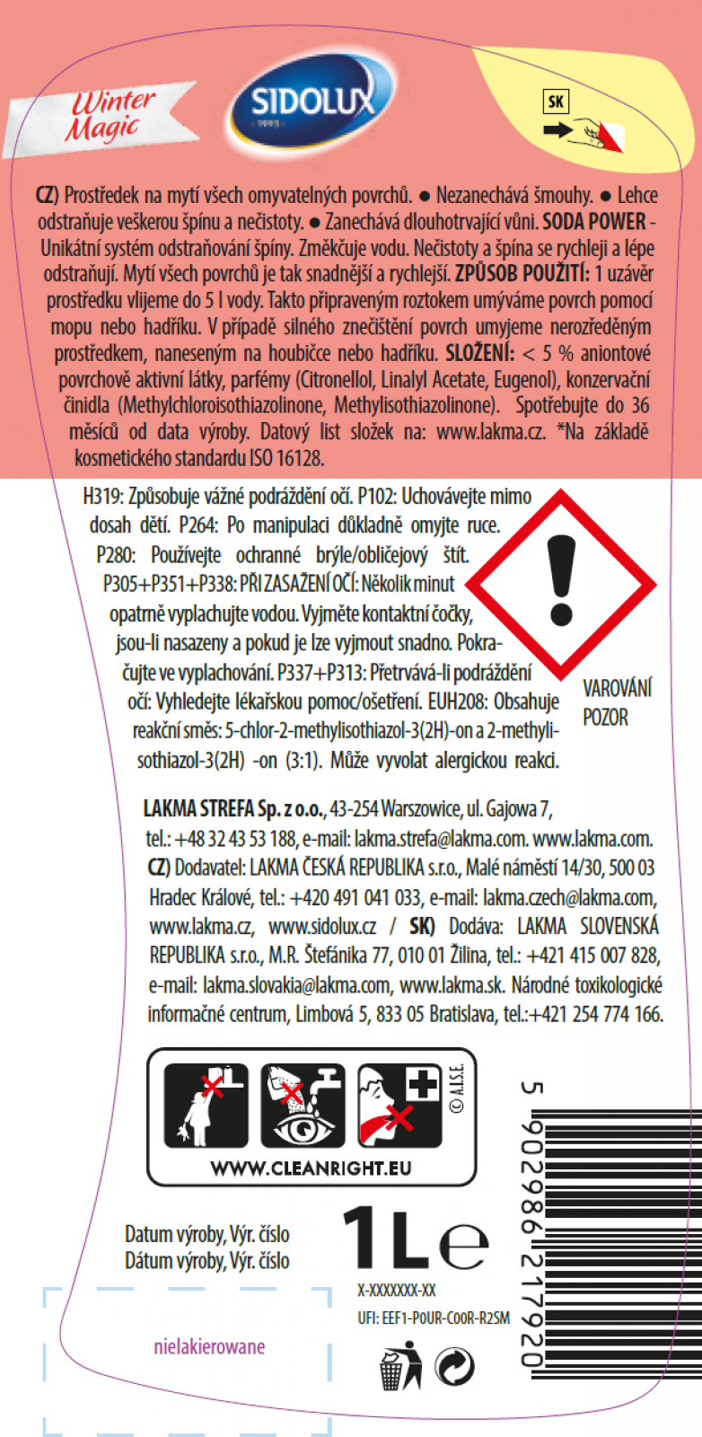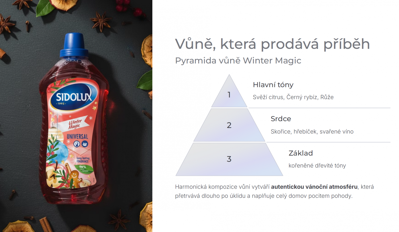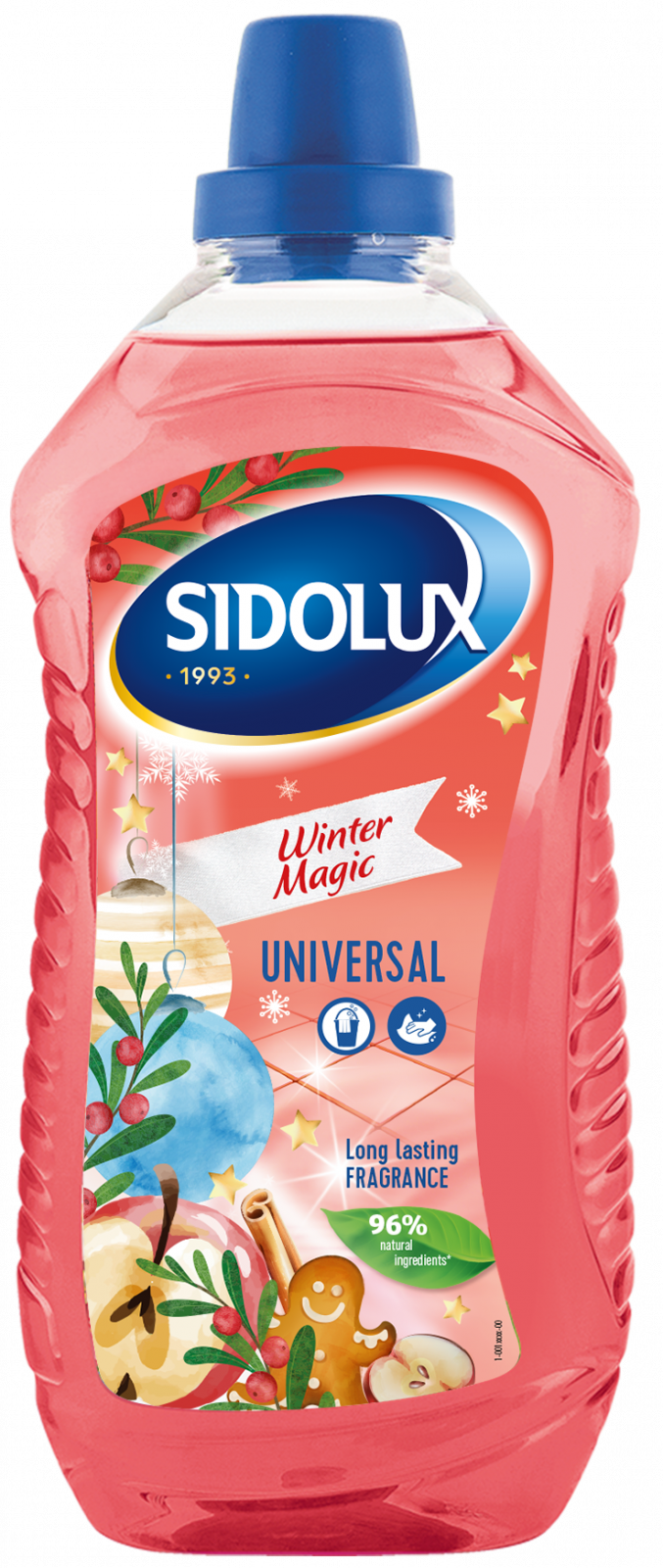 Sidolux je všestranným vonným čistícím prostředkem na všechny omyvatelné povrchy. Obsahuje funkci Soda power, takže si poradí s většinou nečistot i mastnotou. Lze používat jako roztok s vodou pro běžné vytírání a otírání povrchů nebo jako koncentrát na silné nečistoty a mastnotu. celý popis Harmonická kompozice voní vytváří autentickou vánoční atmosféru, která přetrvává dlouho po úklidu a naplňuje celý domov pocitem pohody.