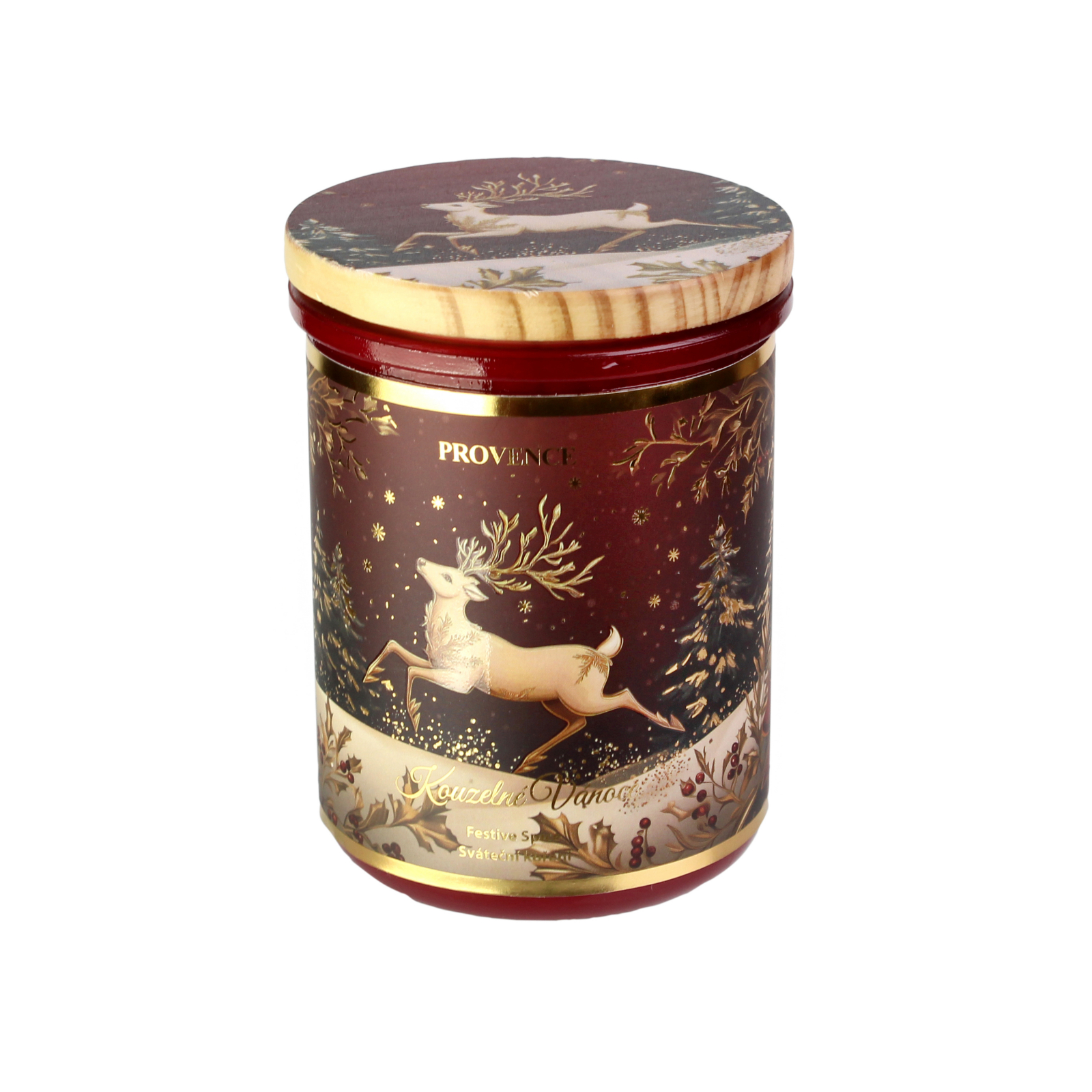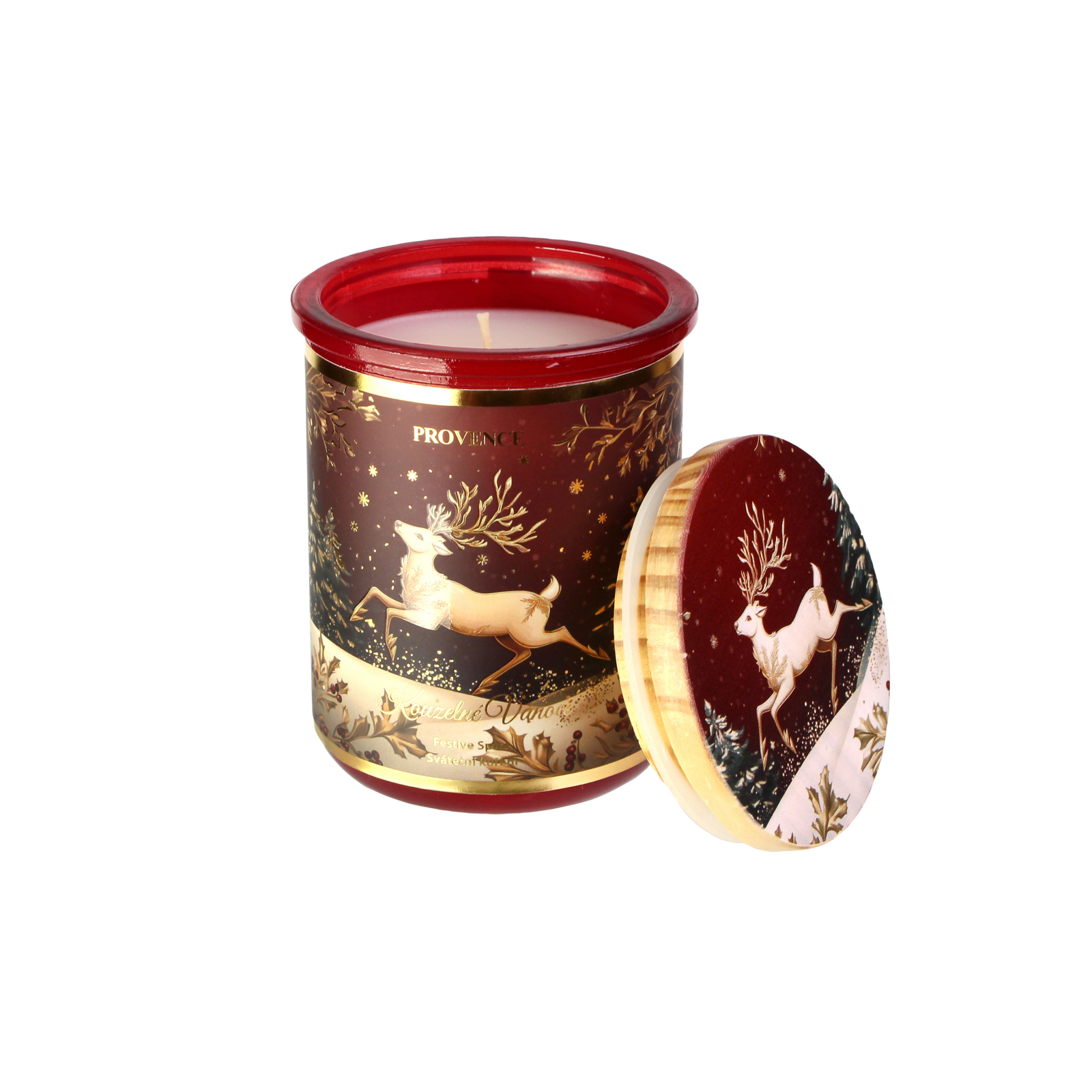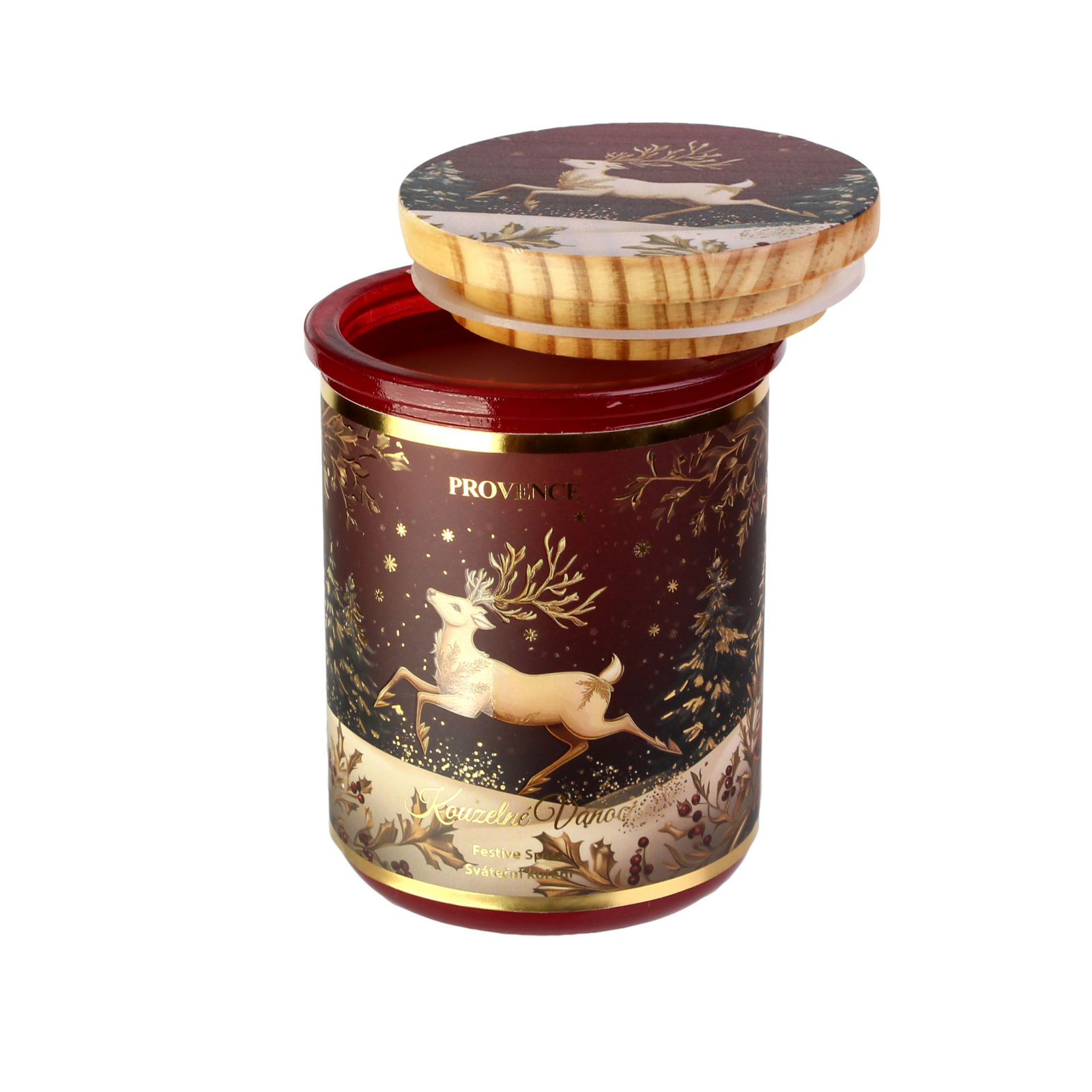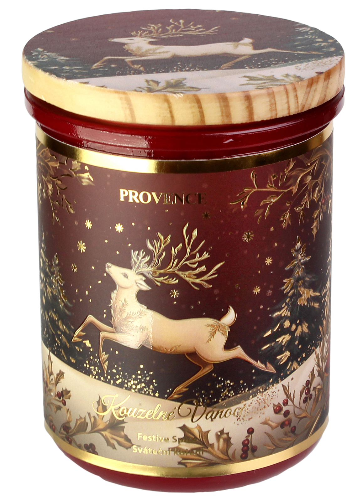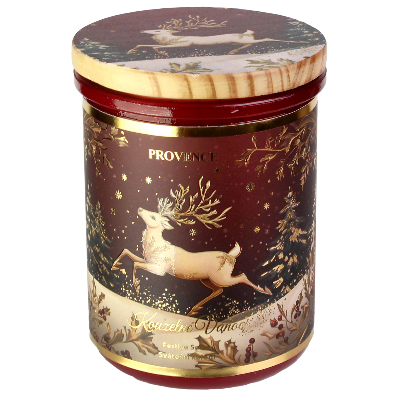 Vánoční vonná svíčka Provence ve skle sváteční koření vyniká intenzivní vůní hřejivého koření, která okamžitě navodí pocit domova, klidu a pohody. Kombinuje tóny skořice, hřebíčku a pomerančové kůry, které se pojí do neodolatelné vůně čerstvě upečeného cukroví. Svíčka je zasazena celý popis do elegantní skleněné nádoby v červeném odstínu se zlatým vánočním jelenem, doplněné o dřevěné víčko se stejným motivem. Hoří až 30 hodin, takže se stane dokonalým společníkem během adventu i svátečních dnů. Průměr 8 cm. Výška11 cm. Délka hoření až 30 hodin. Hmotnost výplně 240 g.
