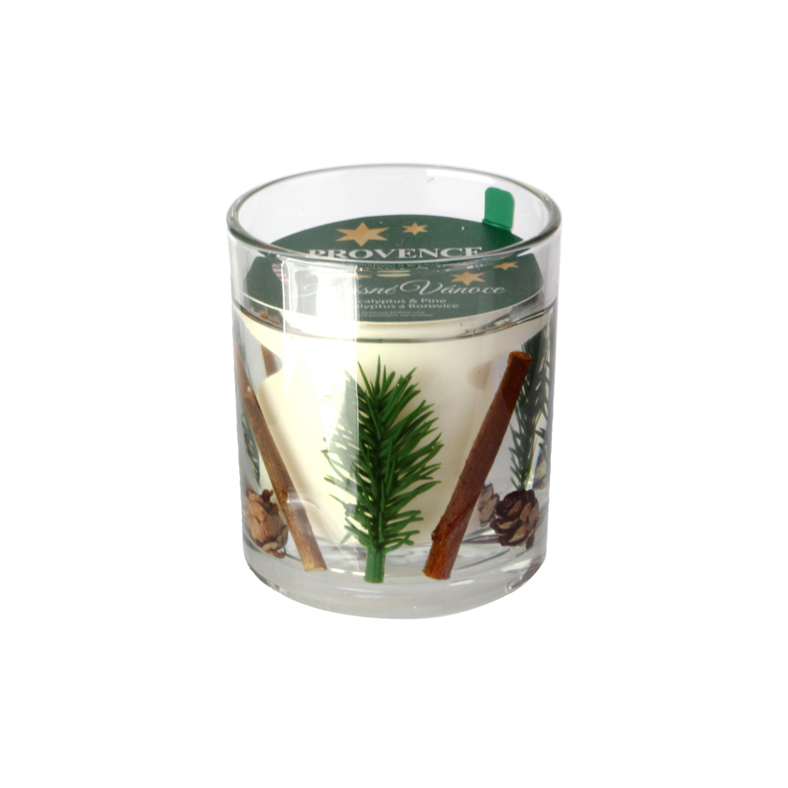 Vonná svíčka Provence eukalyptus & Borovice je skutečným klenotem mezi vánočními dekoracemi. Unikátní dvojité sklo ukrývá mezi stěnami speciální gel s dekorativní výplní - kousky jehličí, celou skořici a malé šišky, které společně vytvářejí úžasný zimní efekt. Po zapálení svíčky celý popisse světlo krásně odráží mezi vrstvami skla a gelu, čímž vzniká hřejivá atmosféra připomínající lesní klid. Vůně eukalyptu a borovice dodává svěžest, čistotu a přirozenou energii, která nádherně doplní zimní období i sváteční chvíle s rodinou. Průměr 8 cm. Výška 9 cm. Délka hoření až 18 hodin. Hmotnost výplně 206 g.