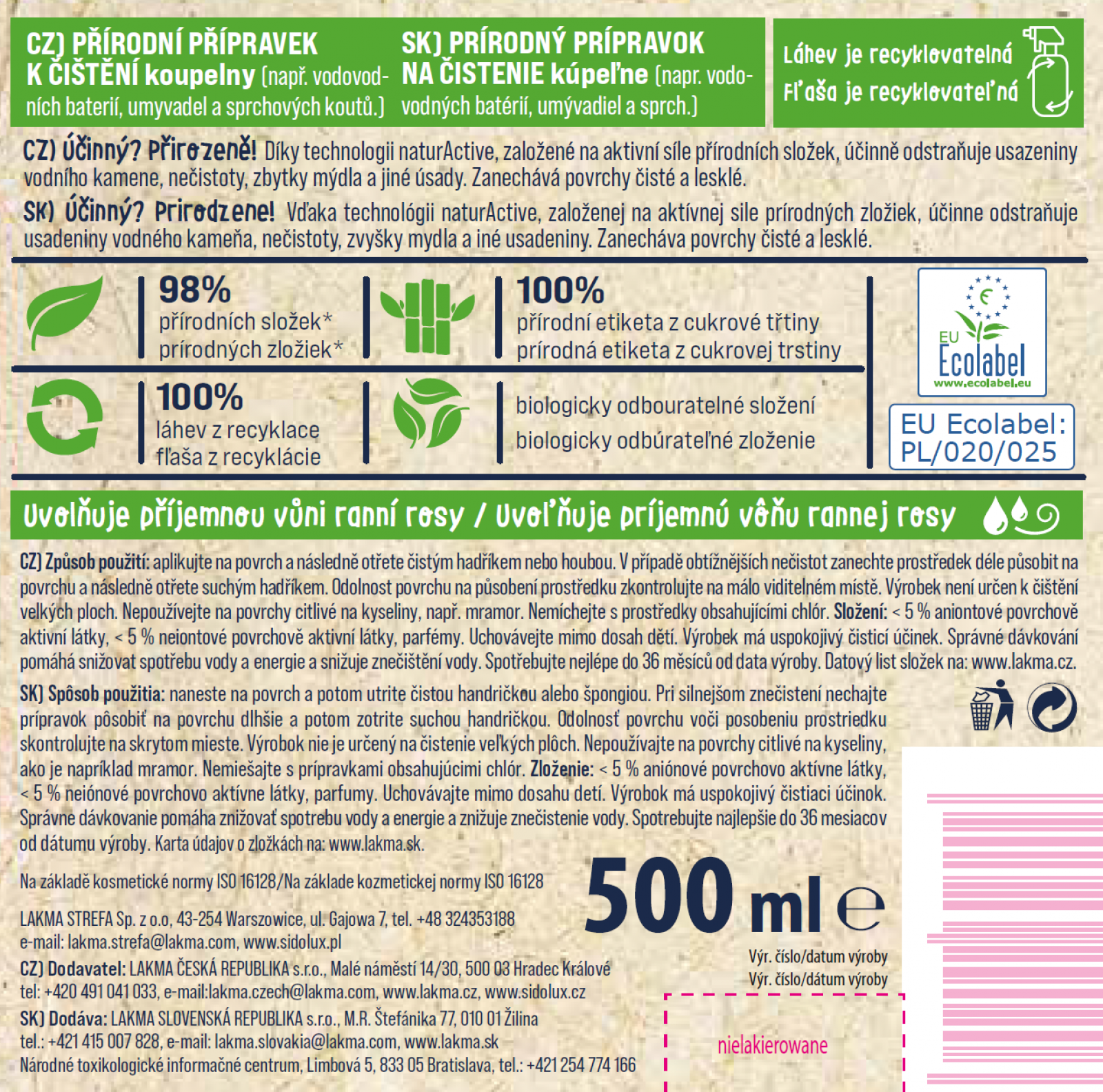 Přírodní přípravek k čištění koupelny (např. vodovodních baterií, umyvadel a sprchových koutů). Díky technologii naturActive, založené na aktivní síle přírodních složek, účinně odstraňuje usazeniny vodního kamene, nečistoty, zbytky mýdla. Zanechává povrchy čisté a lesklé. Uvolňu celý popisje příjemnou vůní ranní rosy.