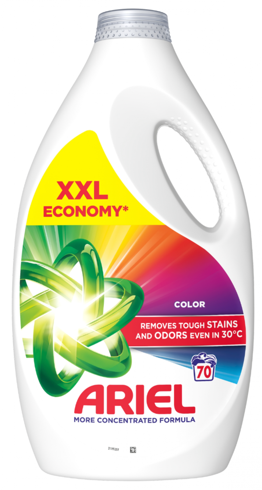 ARIEL Color gel 70 pracích dávek, určený na barevné prádlo, kombinuje nejlepší účinky Arielu při odstraňování skvrn a péči tekutého Arielu, nezanechává zbytky, uchovává zářivé barvy a bělost prádla. Nová koncentrovaná síla.