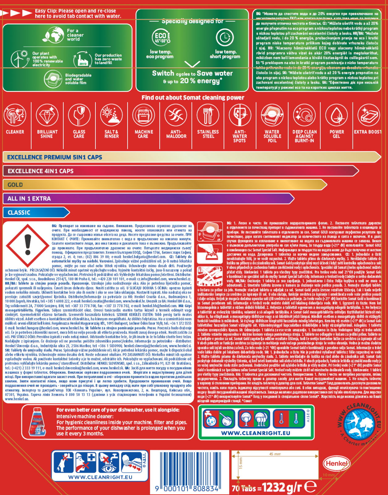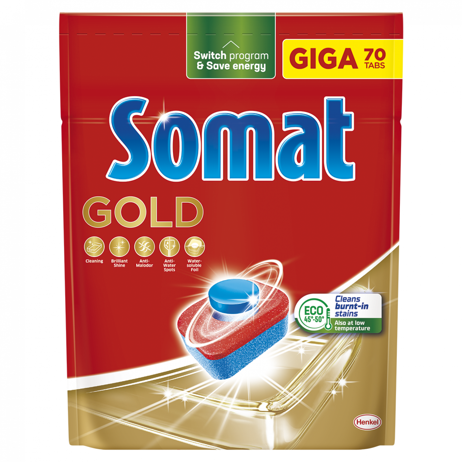 Zažijte silnou a účinnou čisticí sílu s tabletami do myčky Somat Gold. Jejich efektivní a rychle působící složení si poradí i s těmi nejodolnějšími zbytky jídla, jako jsou usazená mastnota, připálené jídlo nebo skvrny od čaje a kávy. Složení se rychle rozpouští a působí okamžitě, celý popis aby nádobí a sklenice byly zářivě čisté po každém programu mytí nádobí, a to i na eco program s nízkou teplotou.