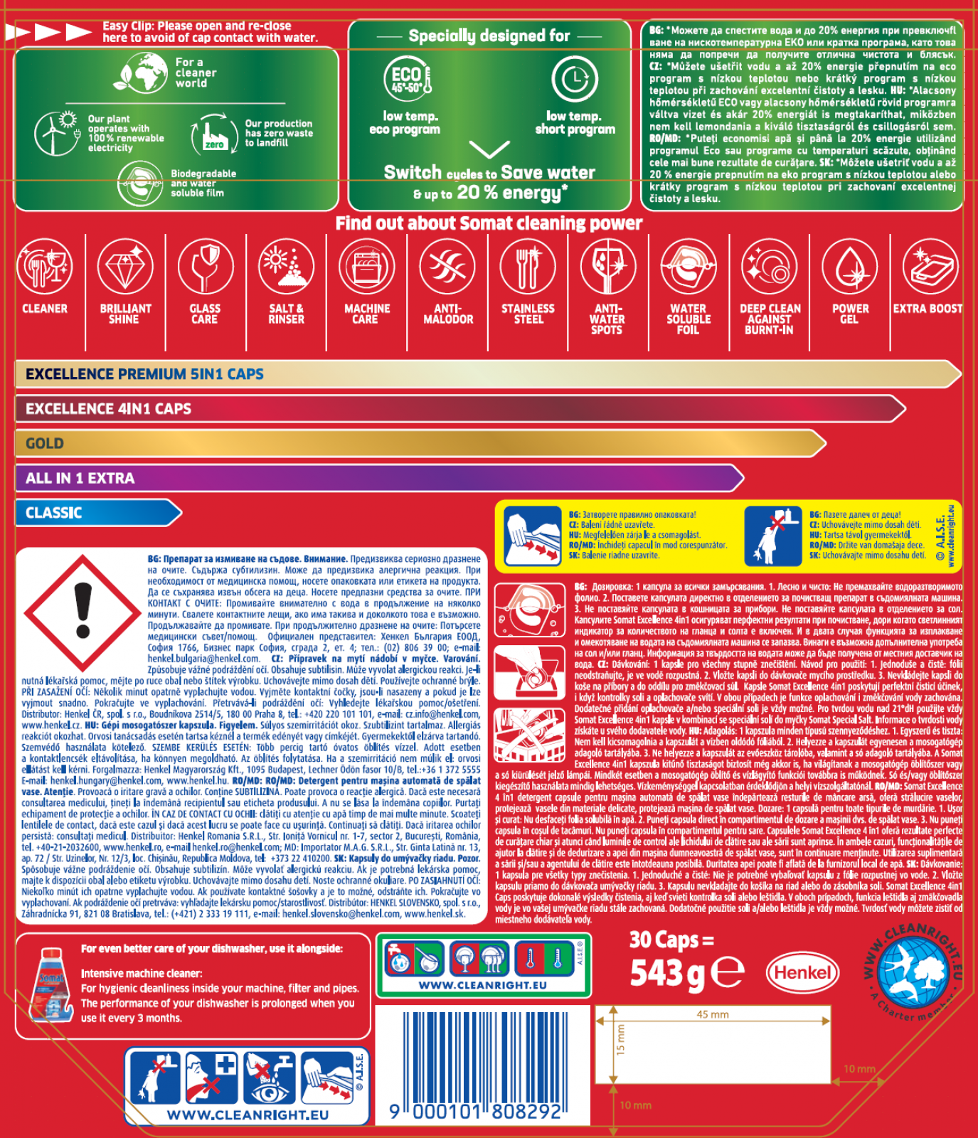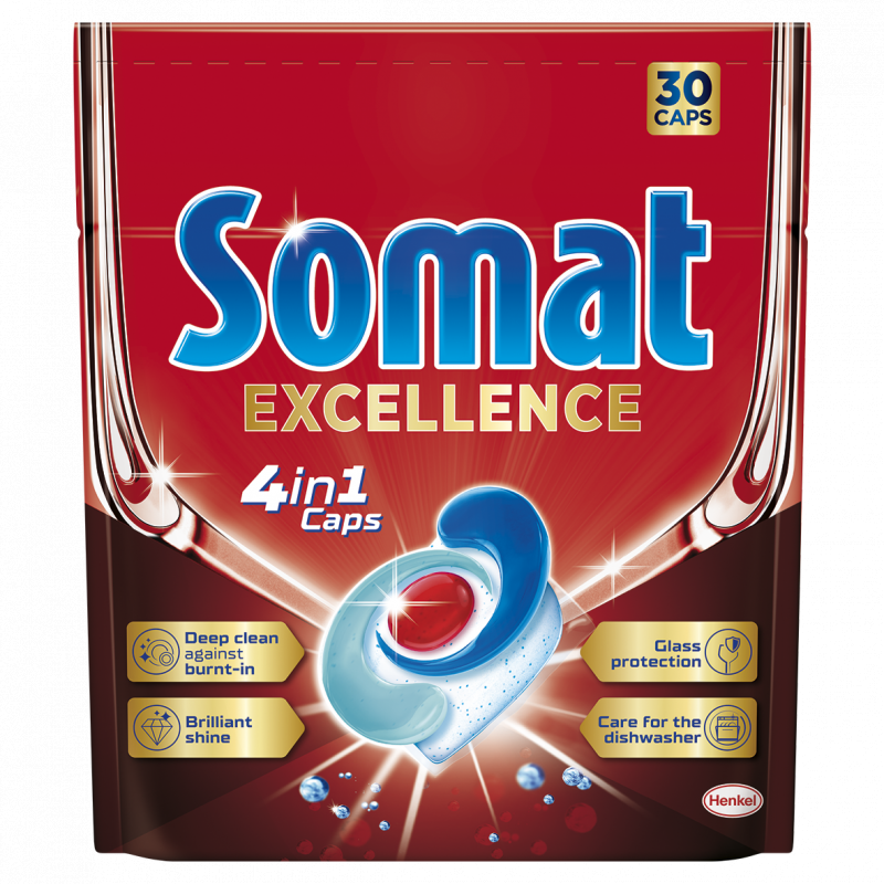 Somat Excellence 4v1 kapsle na mytí nádobí obsahují prémiový multifunkční prostředek na mytí nádobí vyrobený z prášku v kombinaci se 3 jedinečnými pevnými gelovými komorami v biologicky odbouratelné fólii rozpustné ve vodě. Díky silnému složení, které působí proti odolným připále celý popisninám.