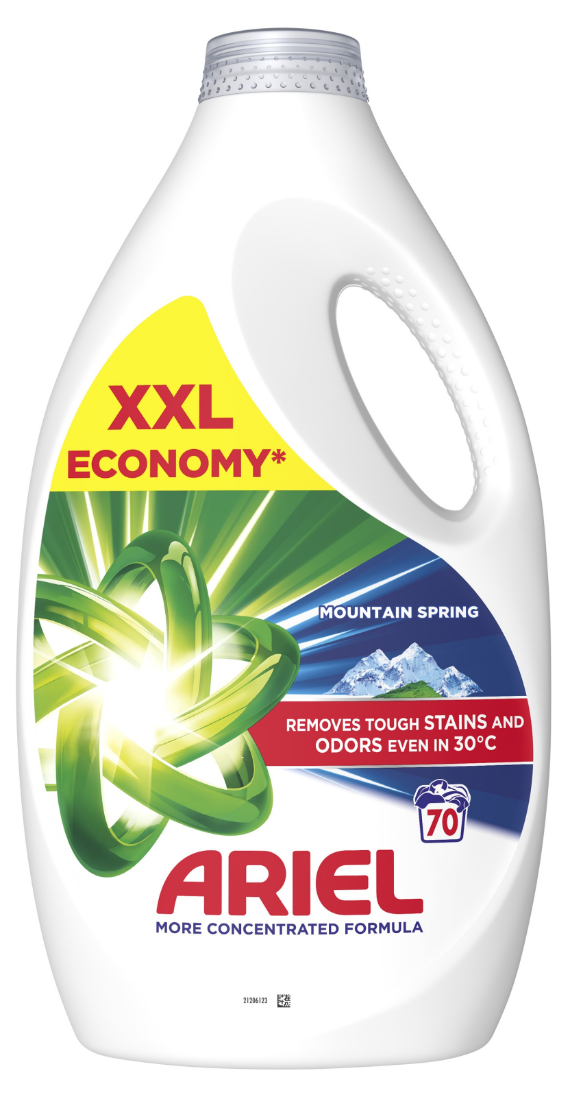 ARIEL Mountain Spring gel 70 pracích dávek, určený na bílé a stálobarevné prádlo, kombinuje nejlepší účinky Arielu při odstraňování skvrn a péči tekutého Arielu, nezanechává zbytky, uchovává zářivé barvy a bělost prádla. Nová koncentrovaná síla.