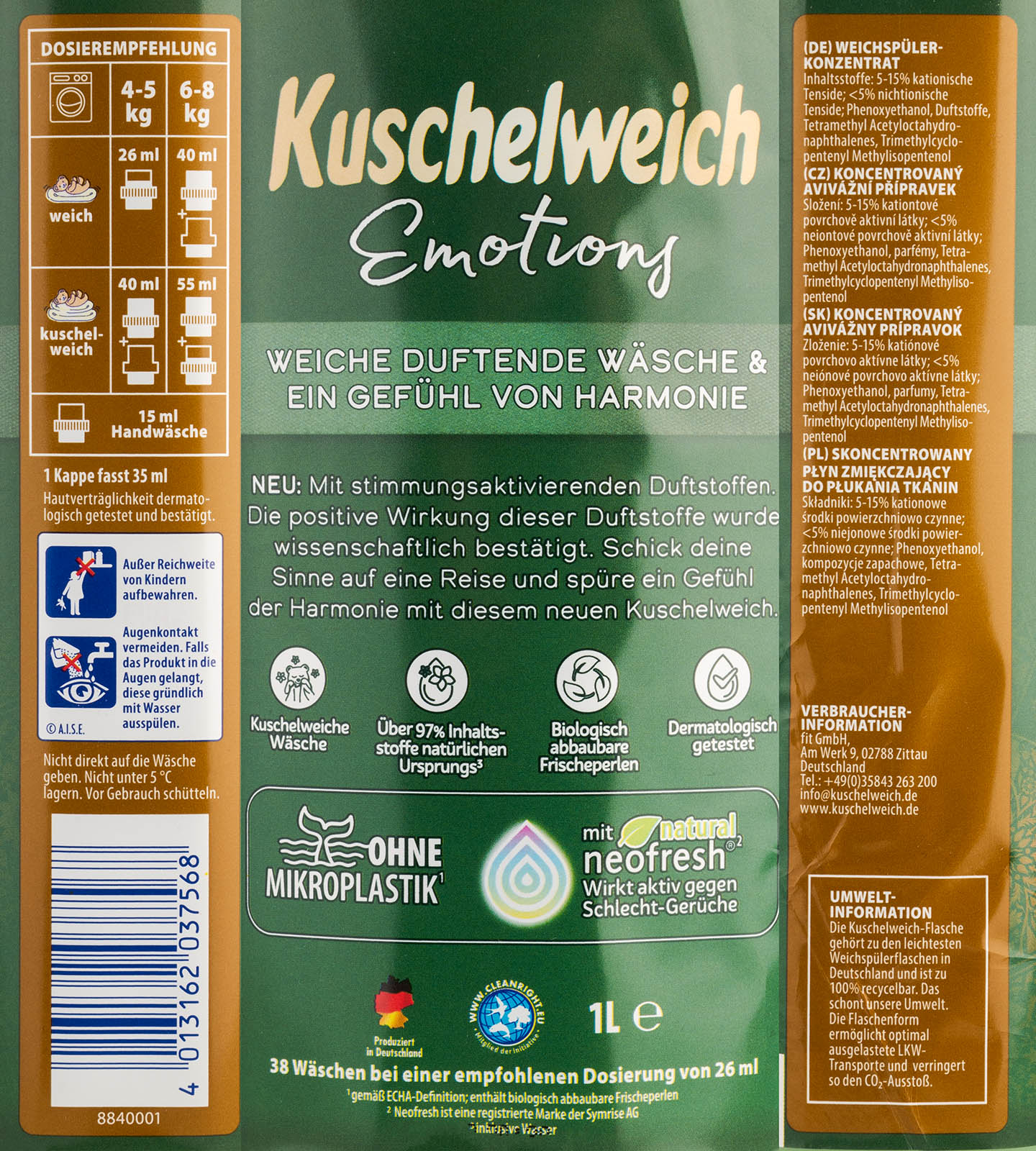 Koncentrovaná aviváž Kuschelweich 1l Harmonie s dlouhotrvající vůní.