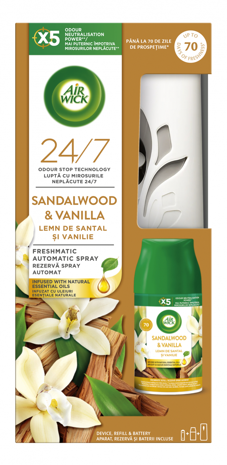 Vyberte si ze tří nastavení pro dosažení požadované intenzity vůně. Pověste na zeď nebo umístěte na polici či skříňku. 1 AA baterie zahrnuta. Posilte vůni příběhu Vašeho domova s automatickým sprejem od Air Wick Freshmatic. Air Wick Freshmatic uvolňuje dávky nepřetržité svěží vůn celý popisě, takže Váš domov vždy přívětivě voní. Dodejte vašemu domovu novou příjemnou vůni až na 70 dní (při používání na nejnižší úrovni intenzity).