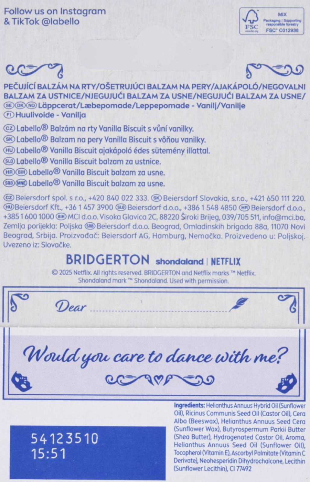 Labello pečující balzám na rty Bridgerton Vanilla potěší rty jemnou vanilkovou vůní a dlouhodobou hydratací. Rychle se vstřebává a vytváří na rtech příjemný ochranný film. Složení balzámu Labello zanechává rty hladké a chráněné před vysušením po celý den. Ideální volba pro každod celý popisenní péči o rty.
