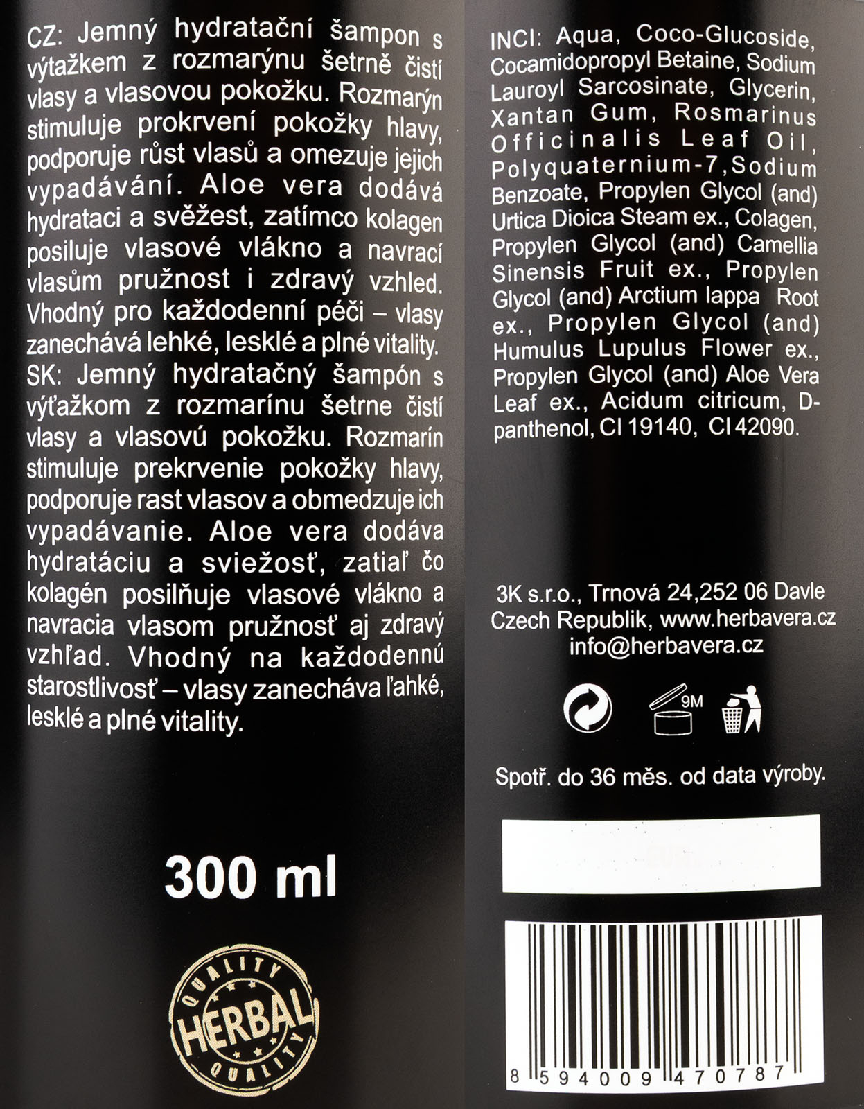 Šampon jemně čistí pokožku hlavy, podporuje prokrvení a zanechává vlasy osvěžené, zdravé a plné života. Ideální pro každodenní péči o suché a namáhané vlasy. Kombinuje účinné přírodní extrakty z rozmarýnu lékařského, aloe vera a kolagenu, které společně revitalizují vlasovou poko celý popisžku, podporují růst nových vlasů a zlepšují jejich pružnost a pevnost.