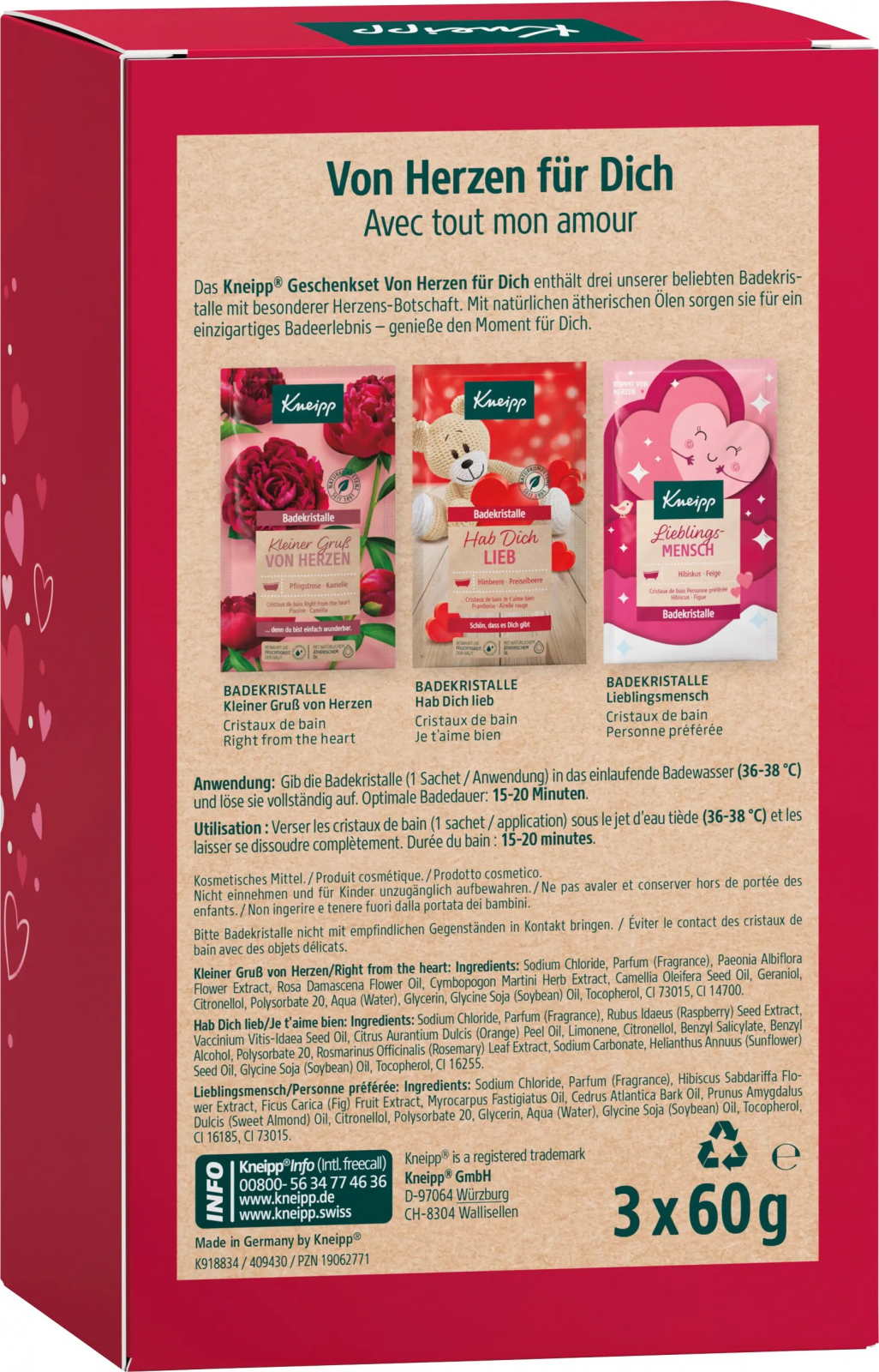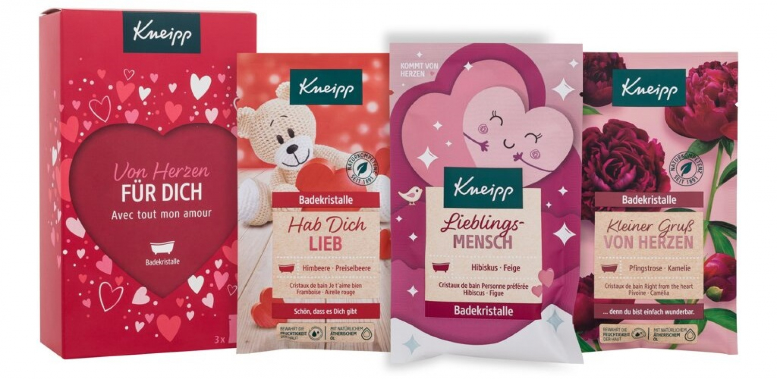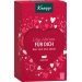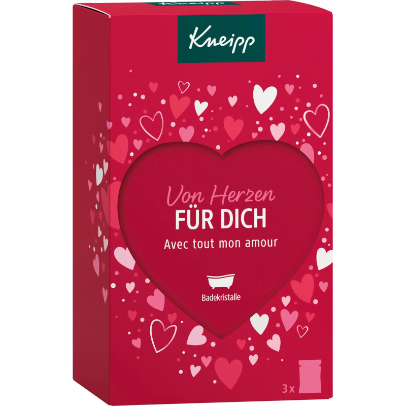 Ukažte své vřelé city dárkem plným srdíček. Dárková sada Kneipp Pro Tebe je tím pravým dárkem k Valentýnu, ke Dni matek a mnoha dalším příležitostem. Krabička s motivy srdíček a velkým výřezem ve tvaru srdce skrývá 3 koupelové soli s okouzlujícími vůněmi. Sůl s výmluvným názvem M celý popisiluji Tě! naplní koupelnu intenzivní ovocnou vůní. Ucítíte brusinky, maliny a pomerančovou kůru. Do koupelové soli Right from the heart se schovala vůně celé kytice, obsahuje výtažky a oleje z pivoněk, růží, kamélií a vonné trávy palmarosa. Poslední koupel se jmenuje Nejmilejší člověk a kombinuje květinové, ovocné i dřevité vůně. V jejím složení najdete výtažky z ibišku a fíků i oleje z exotických dřevin. Všechny koupelové soli pečují o pokožku, takže bude sametově hebká.