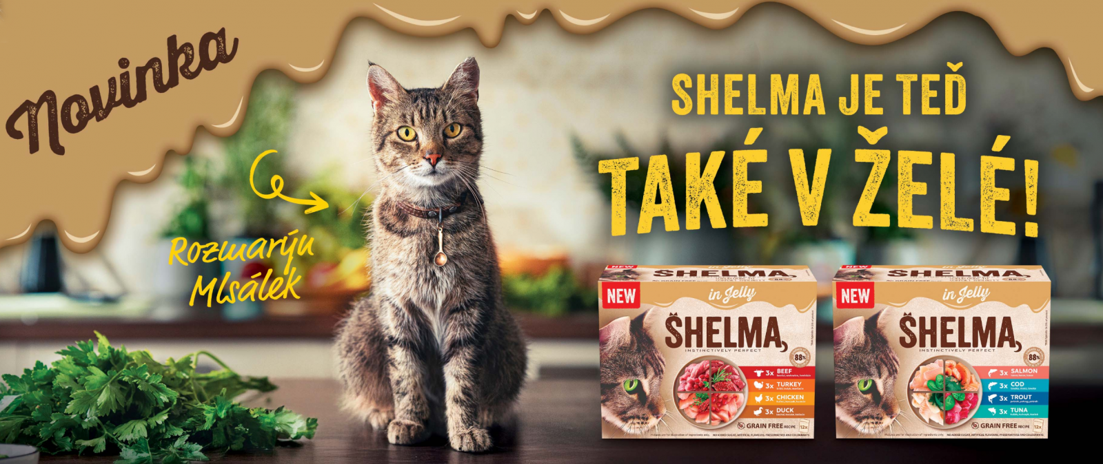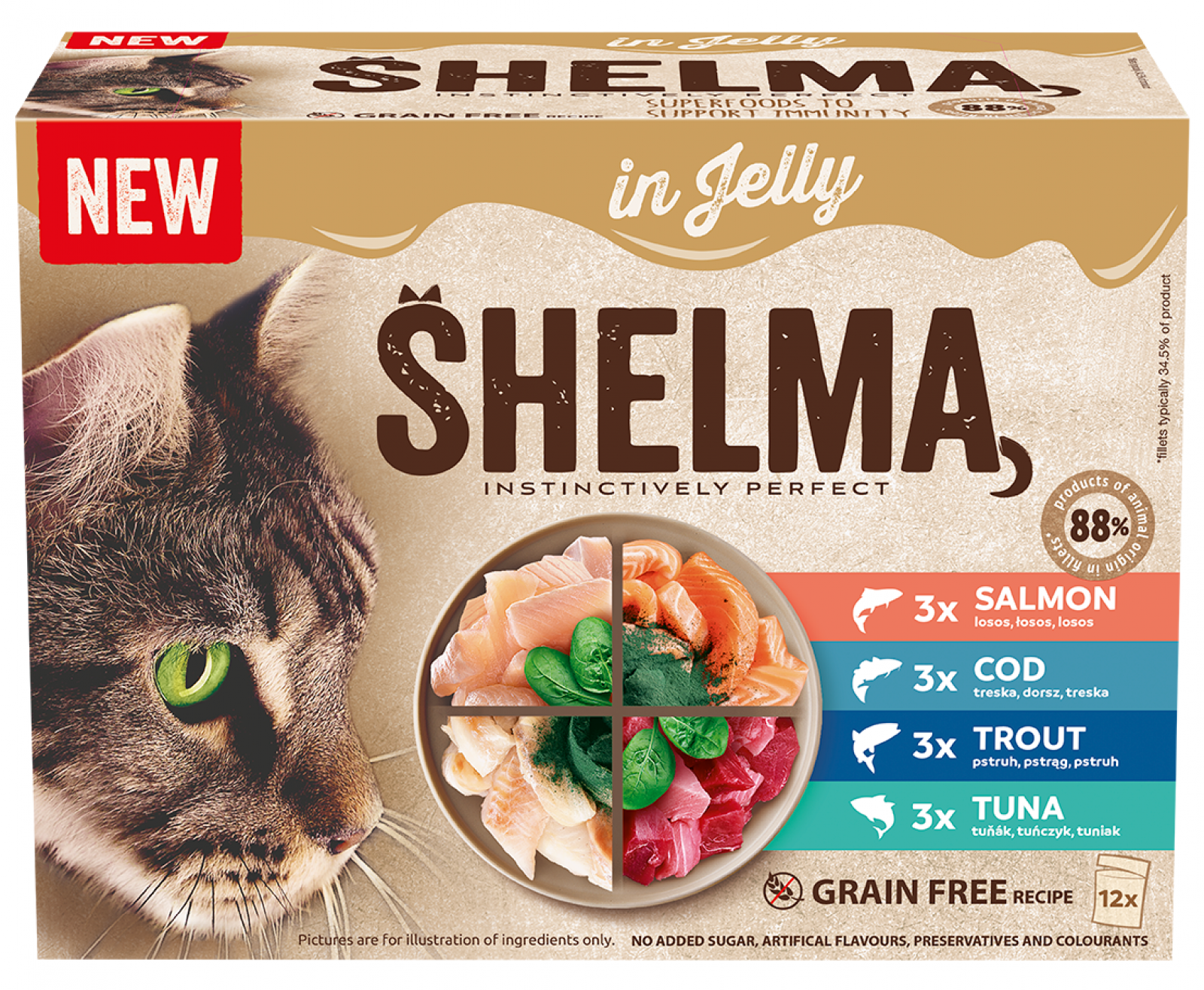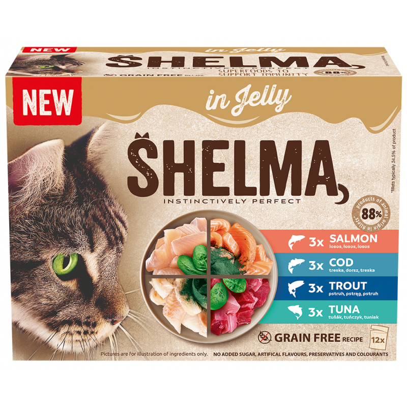 SHELMA bezobilné dušené filetky. 3x s lososem a spirulinou v želé, 3x s treskou a spirulinou v želé, 3x s pstruhem a špenátem v želé a 3x s tuňákem s špenátem v želé. Kompletní krmivo pro dospělé kočky.