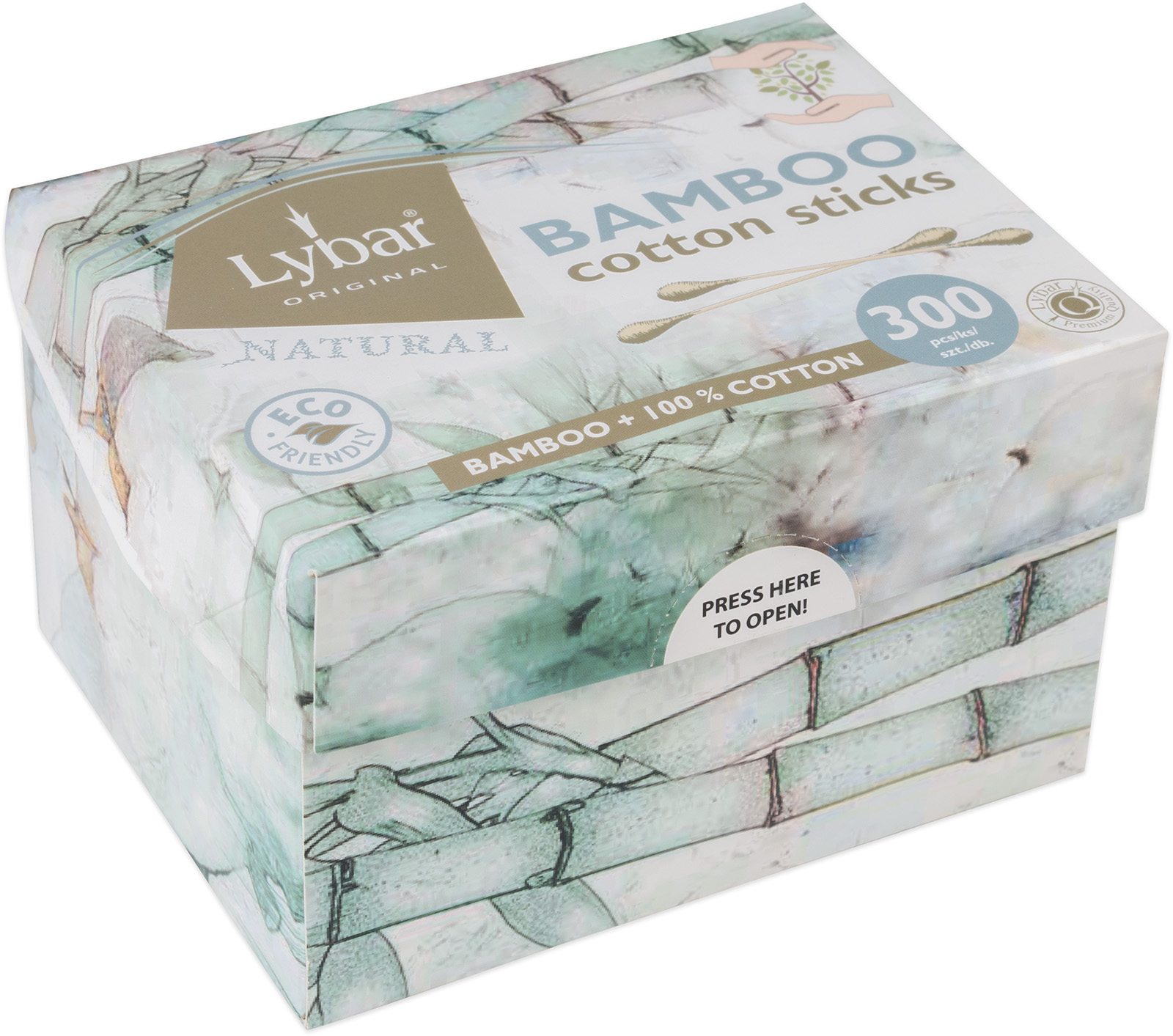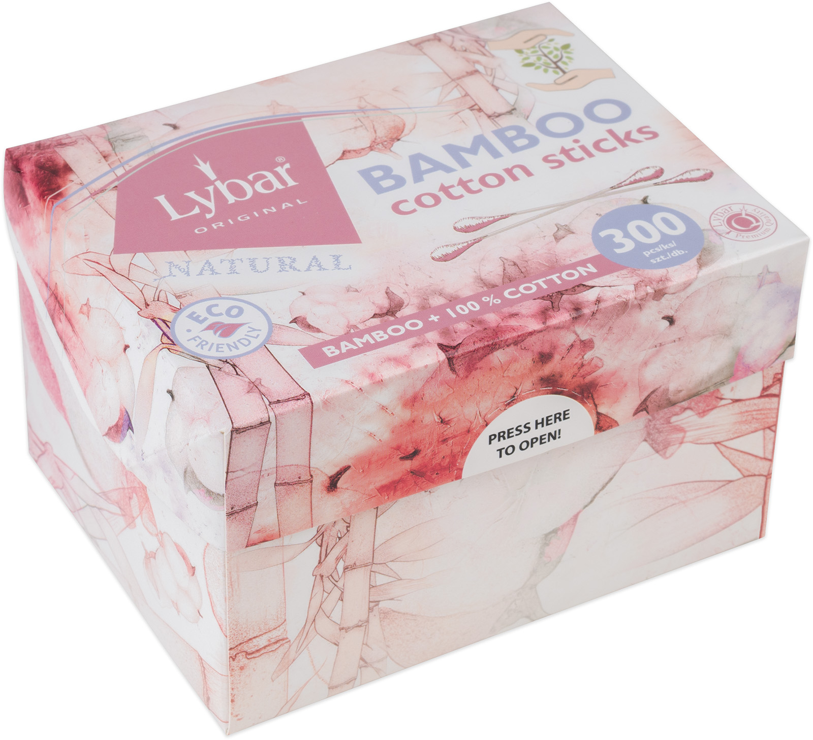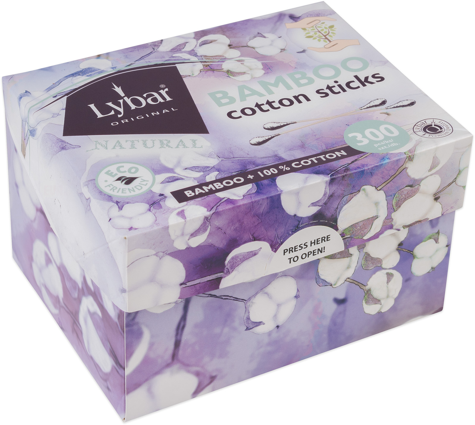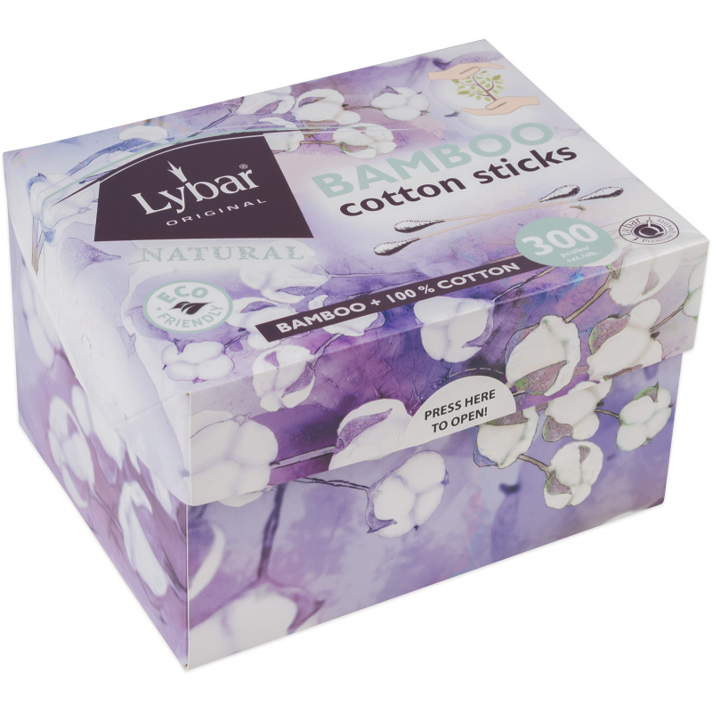 Vatové tyčinky pro každodenní hygienu vyrobené ze 100% bavlny a bambusu, šetrné k životnímu prostředí. V balení 300 ks. Papírová krabička s různobarevným potiskem - dodáváme dle skladové dostupnosti.