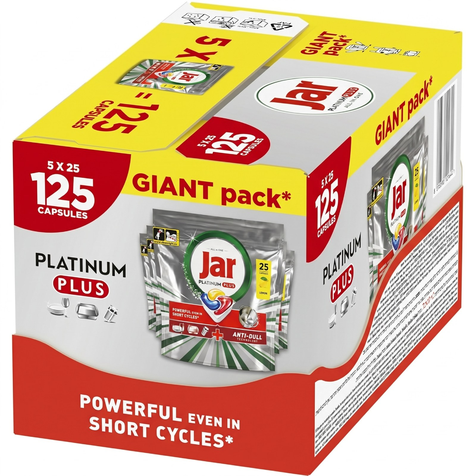 JAR Platinum Plus kapsle 125 ks, tekutá část kapsle se silným odmašťujícím účinkem, obsahuje již oplachovač, nádobí zanechá lesklé, změkčující sůl zanechá sklo beze skvrn, prášková část kapsle má funkci namáčení, její rychlá rozpustnost zajistí dokonalé odstranění odolných skvrn celý popisi od čaje. Navíc pomáhají při odstranění zašedlosti nádobí - účinné na usazený vodní kámen na nádobí. Spotřebujte do 18-ti měsíců od data výroby uvedeném na obale.