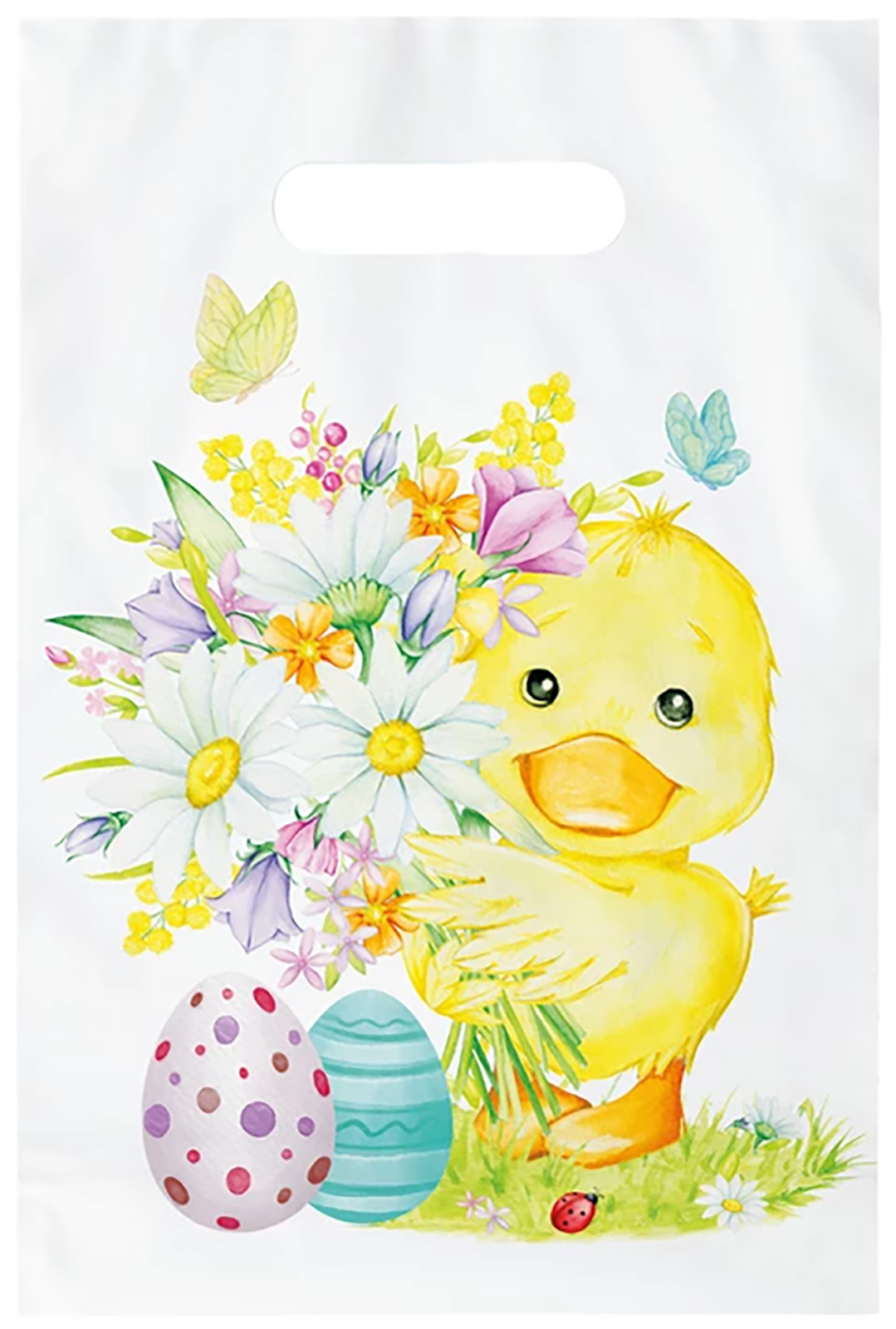 Kvalitní dárkový sáček s průhmatem vhodný na velikonoční nadílku. Motiv je na sáčku umístěn na přední straně, zadní strana je bílá bez potisku. Rozměry: šířka 20 cm, výška 30 cm, dno má hloubku 8 cm, síla fólie 35 mikronů. Materiál: LDPE - igelit. Fólie je určená pro přímý styk s celý popis potravinami a je zdravotně nezávadná. Každý sáček je opatřen čárovým kódem.