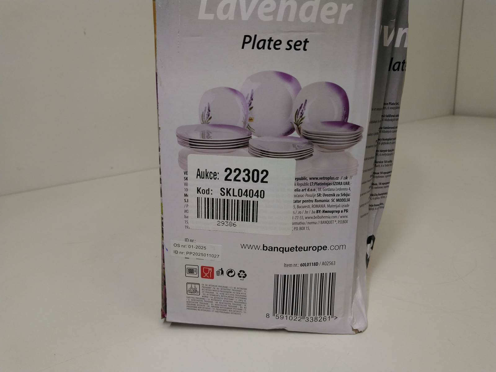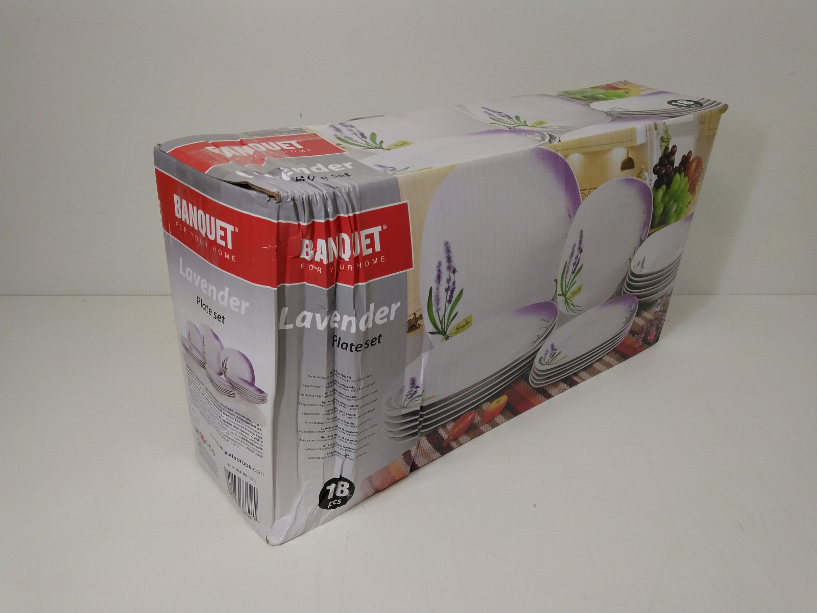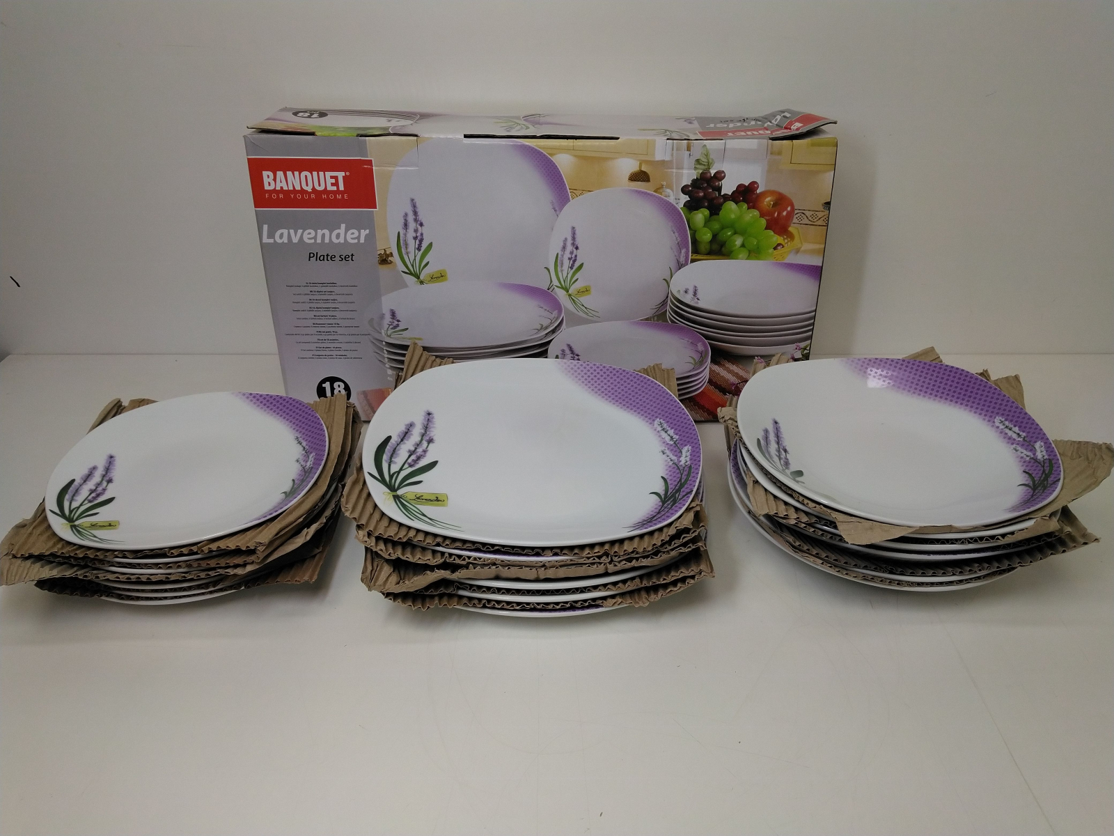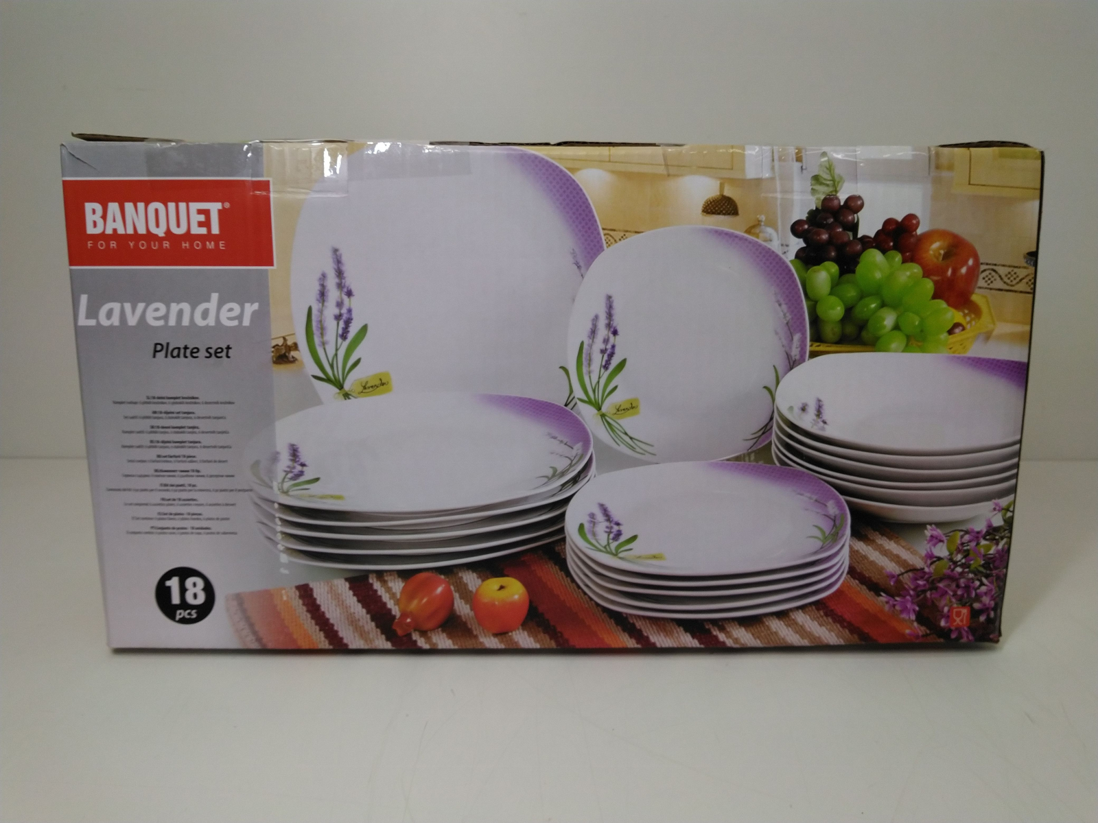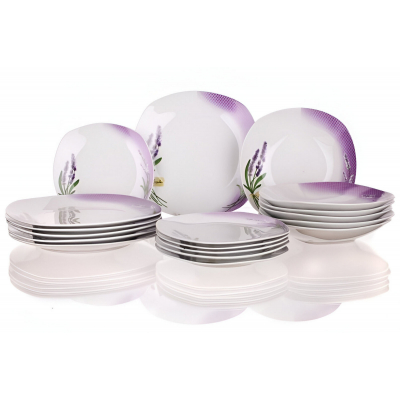 Talířová sada 18 dílů obsahuje: 6x dezertní talíř (diagonála 20cm, šířka 18,5cm), 6x hluboký talíř (diagonála 23cm, šířka 22cm) , 6x mělký talíř (diagonála 27cm, šířka 25cm), všechny talíře mají hranatý tvar, lze mýt v myčce i používat v mikrovlnné troubě. Motiv levandule.