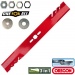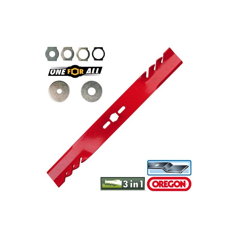 Velmi kvalitní univerzální nůž Oregon na mulčování, díky speciálně tvarovanému patentovanému tvaru nože dochází k intenzivnímu víření posečené trávy v prostoru rotujícího nože, přídavné čepele zaručují maximální efekt mulčování trávy na velmi malé kousky, délka nože 50,2 cm, souč celý popisástí nože jsou redukce na výstupní hřídele průměrů: 10, 12,7, 16, 18 mm, síla materiálu nože 4 mm.