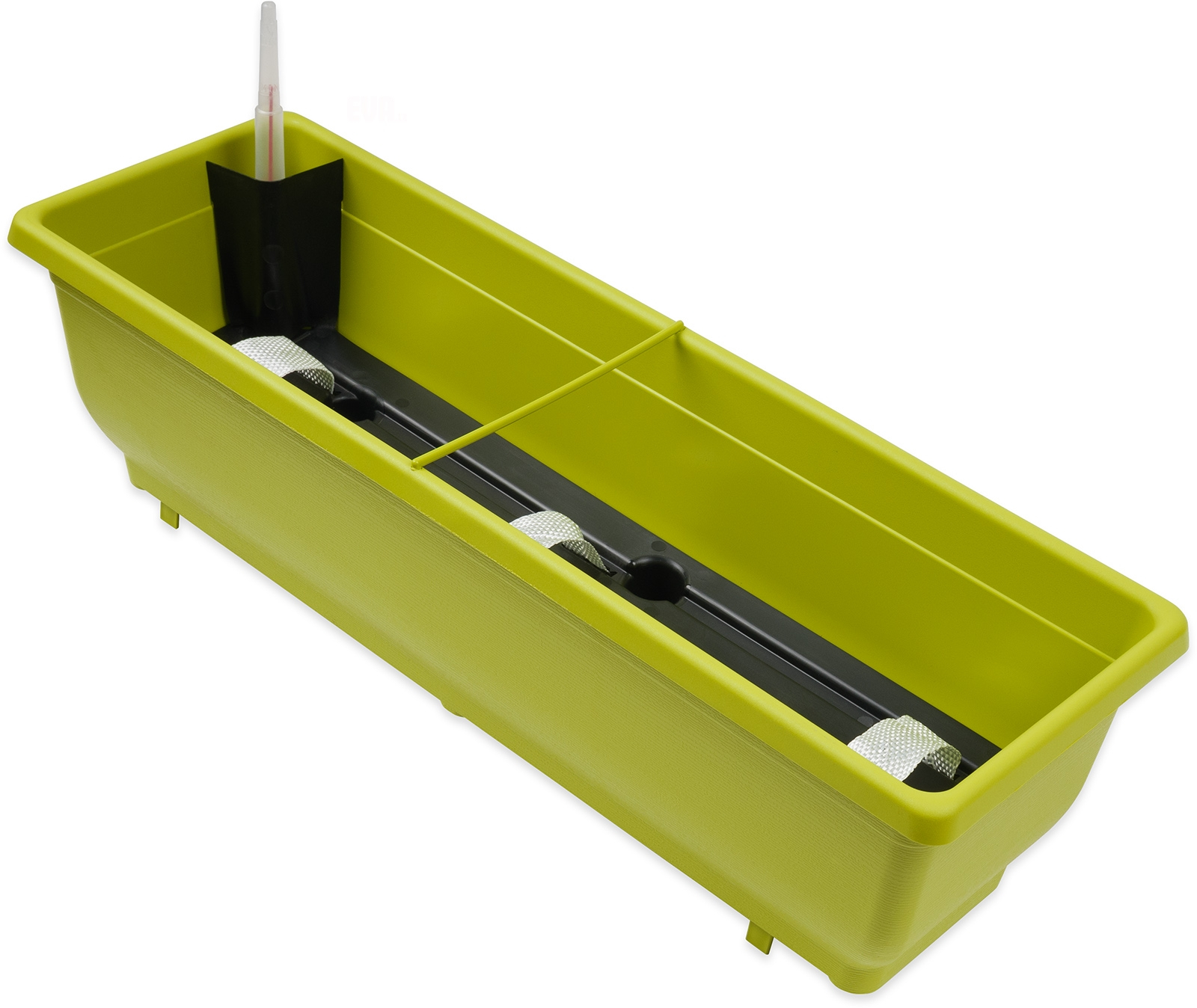 Plastový samozavlažovací truhlík v zelené barvě. Rozměry (š x v x h): 75 x 17 x 19 cm. Vhodný k pěstování květin a zeleniny, řízkování květin. Vyroben z matného, kvalitního plastu. Součástí je: spona proti deformaci, vyrovnávací nožičky pro šikmé parapety, 3 textilní knoty, vodoz celý popisnak. Ideální poměr vody a substrátu. Český výrobek.