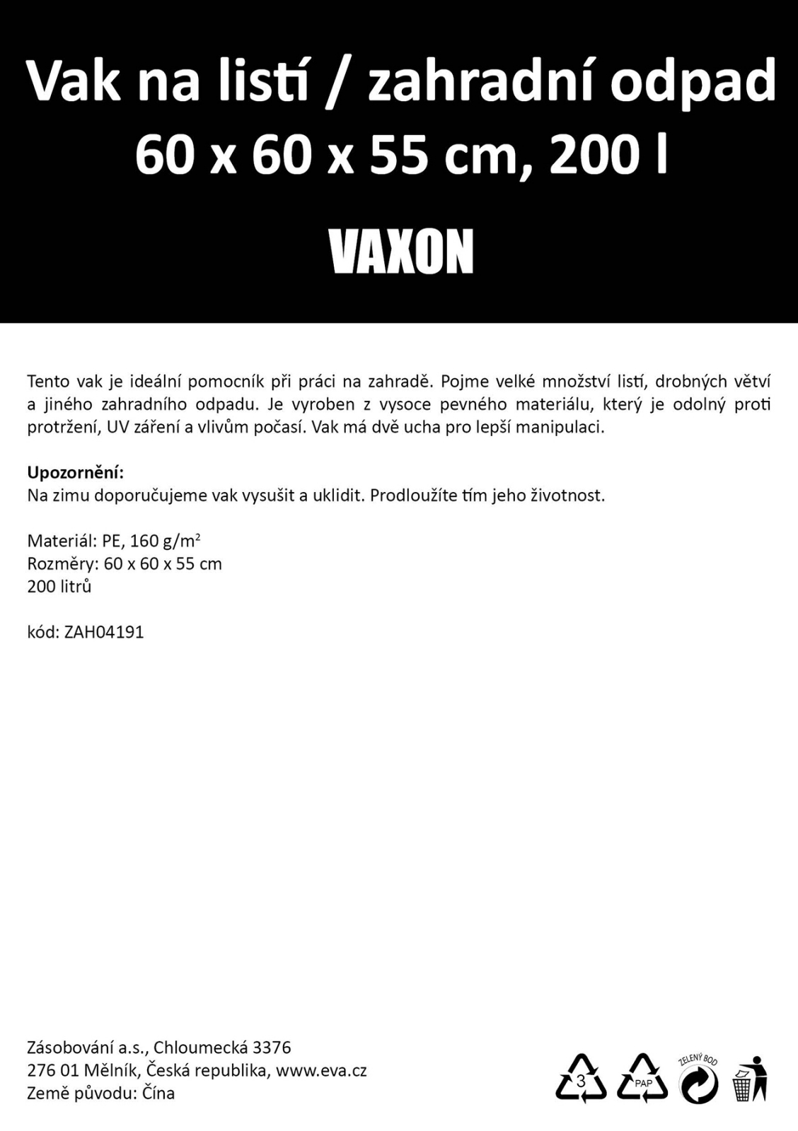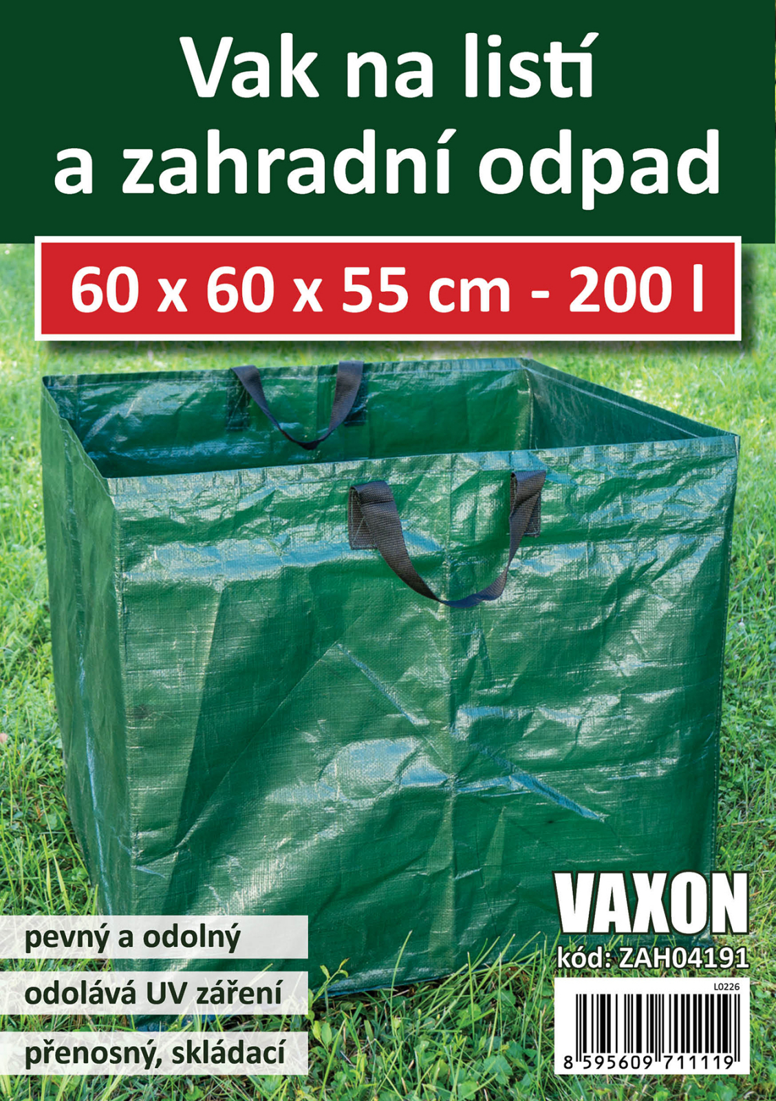 Velký vak na listí a další zahradní odpad je ideální pomocník při práci na zahradě. Pojme velké množství listí, trávy, drobných větví a jiného lehkého zahradního odpadu. Je vyroben z vysoce pevného materiálu (PP, 160 g/m2), který je odolný proti protržení, UV záření a vlivům poča celý popissí. Koš má 2 ucha pro snadné přenášení a manipulaci. Rozměry vaku 60 x 60 x 55 cm , objem cca 200 l.
