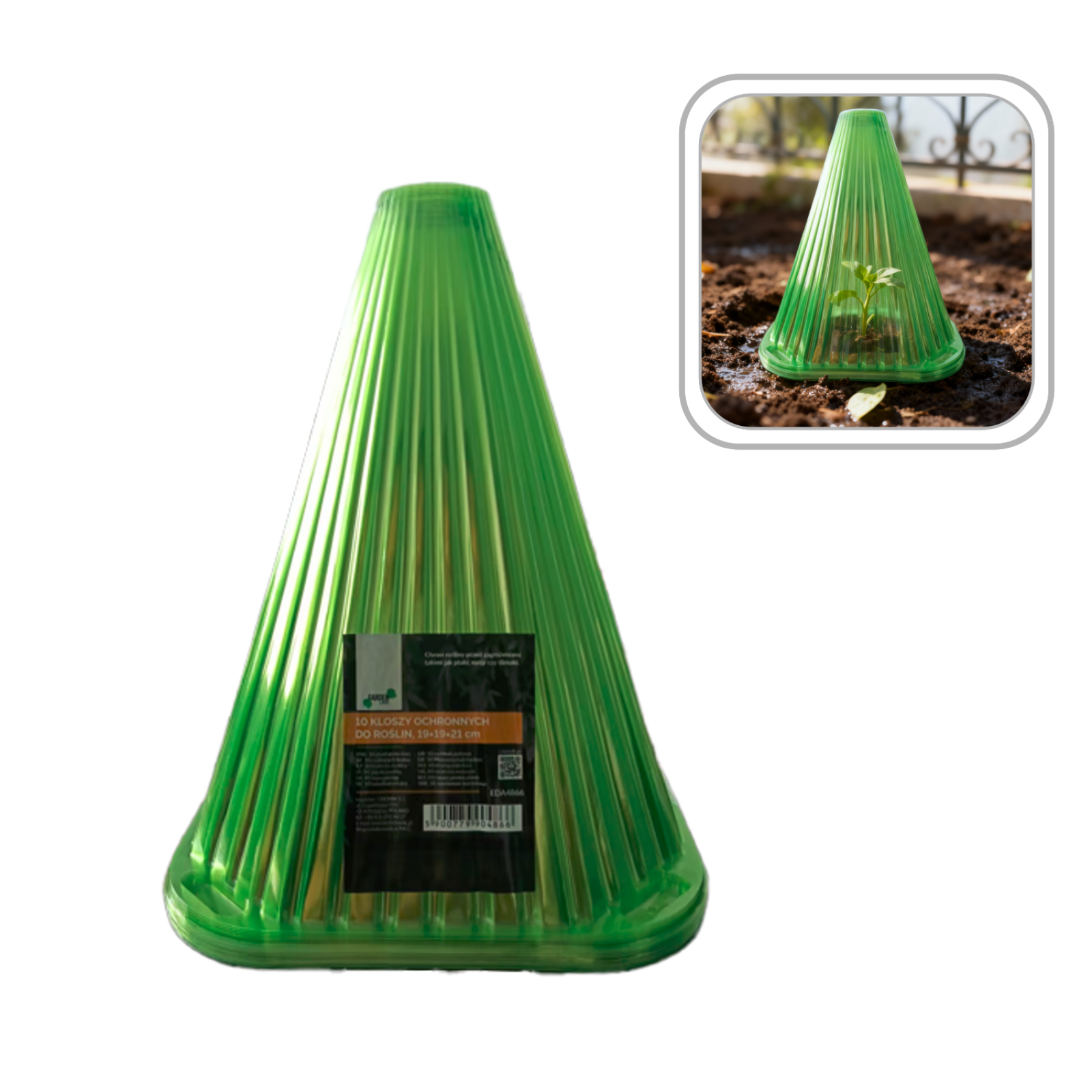 Ochranný kryt, na sazenice, menší rostliny a zeleninu, ve tvaru kužele, vyrobený z plastu. Efektivní bariéra rostlin (salátů) proti napadení slimáky. Kryt je možno ukotvit kolíky skrze otvory v rozích (nejsou součástí balení). Díky otvoru v horní části lze rostliny zalévat bez od celý popisnímání krytu.