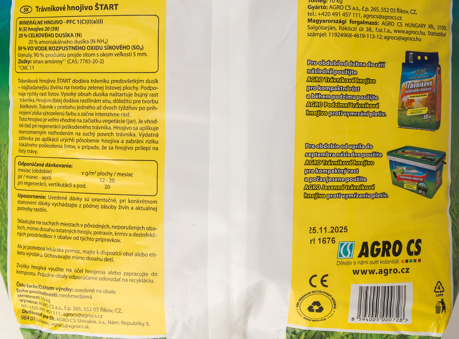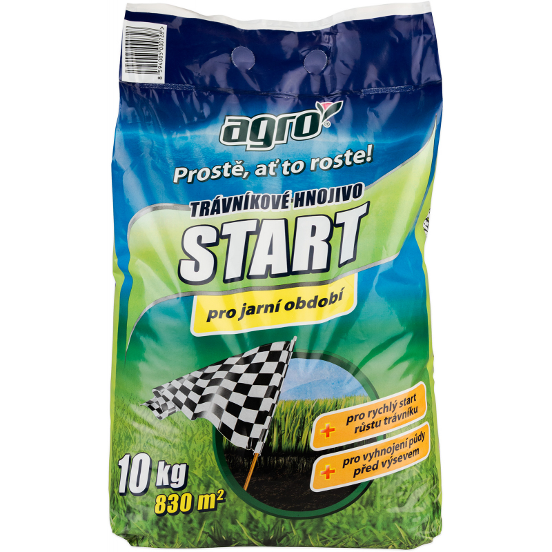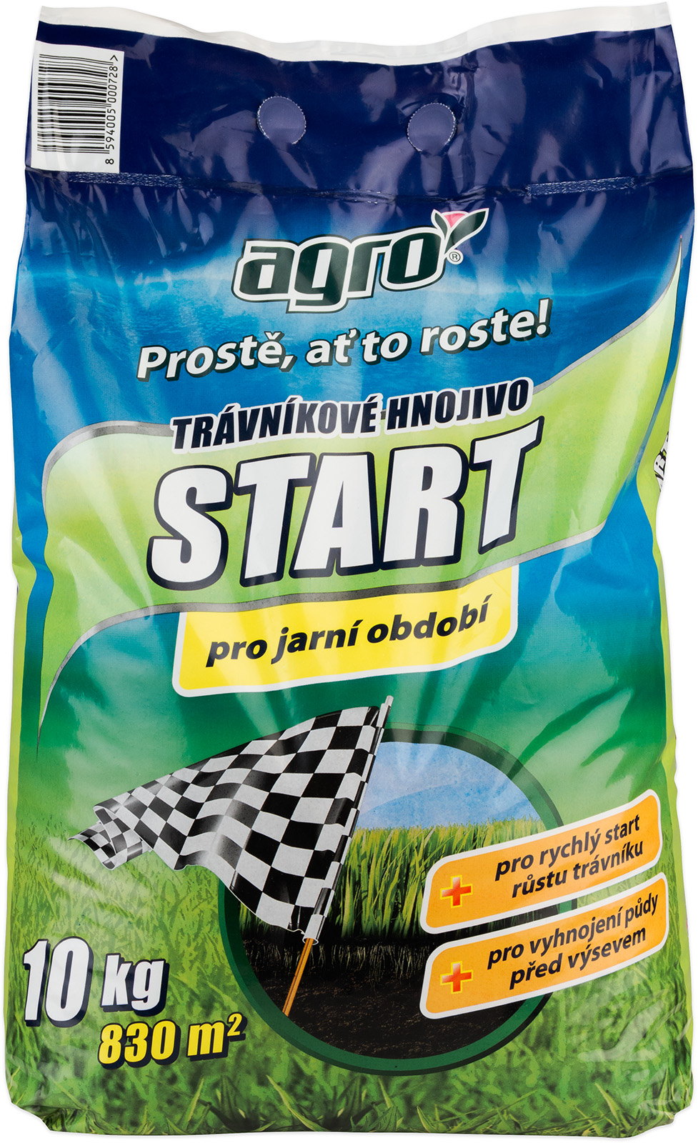 Hnojivo START je určeno pro jarní hnojení trávníku (březen - duben), trávníku dodá potřebné živiny pro rychlou regeneraci a nastartování růstu, lze ho využít pro vyhnojení půdy před výsevem trávníku, je vhodné pro všechny typy trávníků, vysoká dávku dusíku a fosforu podporuje vel celý popismi rychlý a zdravý růst listů a kořenů trav, baleno v igelitovém pytli. Složení dusík + fosfor (14-8) + hořčík 2 %. Dusík je v hnojivu obsažen ve dvou formách, z nichž jedna působí velmi rychle a druhá později, tím je trávník dostatečně vyživován po dlouhou dobu. Fosfor podporuje nárůst kořenů, takže tráva bude získávat z půdy více vody a živin, což urychlí regeneraci trávníku. Hořčík zvyšuje tvorbu chlorofylu – trávník má pak intenzivní zelenou barvu listů. Balení 10 kg vystačí až na 830 m2 plochy.