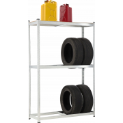 Pevný regál určený pro uložení pneumatik a dalšího příslušenství, kapacita pro 8 pneumatik, horní odkládací police z MDF desky o síle 6,8 mm, maximální nosnost 175 kg, ocelová konstrukce s tloušťkou materiálu 1,1 mm, vhodné pro osobní i motocyklové pneu, rozměry (š x v x h): 120 x 180 x 40 cm.