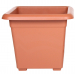 Plastový v půdorysu čtvercový květináč v terakotové barvě, který se jemně kónicky rozevírá a má ohnutý horní okraj směrem ven, stojí na 4 nízkých nožičkách, které jsou jeho součástí, v horní části má vylisované 3 tenké proužky, zhruba uprostřed vede lesklý pruh ve tvaru vln, používá se v interiéru i v exteriéru, rozměry 20 x 20 x 18 cm.